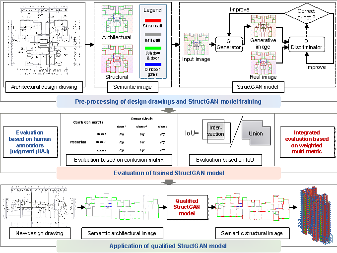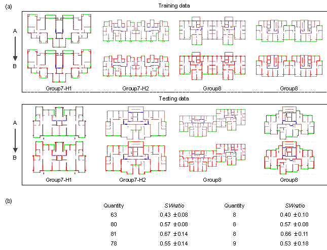 The estimation of design efficiency, safety, and economic performance are elaborated in Section 3.3 StructGAN design. The time consumption of competent engineers is derived from the study of Chakrabarti [22]. The potential seismic losses are analyzed by the widely adopted FEMA P58 method [23], and the values are the mean losses of two typical high-rise shear wall residential buildings. The components of StructGAN are summarized in Figure 1: interpreter, designer, and modeler. The interpreter digests and semanticizes the architectural sketches. Then, the designer analyzes the semantic drawings, performs the inference, and devises the structural design. Finally, the modeler proposes the design and presents the structural model. Table 1 compares the performances of StructGAN and the conventional design process. StructGAN offers a promising increase in speed by a factor of 10, which is equivalent to saving billions of US dollars per annum in the industry. As it learns and evolves continuously, StructGAN will undoubtedly obtain much higher savings. 3 IMPLEMENTATION OF STRUCTGAN Figure 2 The framework of StructGAN, including training, evaluation, and applicationThe StructGAN implementation is illustrated in Figure 2, including three dominating steps: (1) datasets and StructGAN training, (2) StructGAN performance evaluation, and (3) StructGAN application. 3.1 Datasets and StructGAN trainingGAN learns from previous designs based on maximum likelihood estimation, making the probability distributions and qualities of the StructGAN design directly associated with the training datasets. Thus, to ensure the quality of the source design, this study applied approximately 250 pairs of architectural¨Cstructural designs from more than ten famous architectural design and research institutes in China. Moreover, these designs satisfied all relevant design specifications, were optimized and evaluated by experienced engineers, and were adopted in real-world construction applications with excellent quality. Subsequently, based on raw design datasets, semanticization and classification were conducted for the designs. This study adopted the semantic process by extracting essential architectural and structural elements in design images and coding them by color patterns, so that critical design elements and the corresponding structural layout information are maintained. Semantic designs can effectively reduce the dimension of probability distributions and enhance training performance. In this study, the red (RGB = (255, 0, 0)), gray (RGB = (132, 132, 132)), green (RGB = (0, 255, 0)), and blue (RGB = (0, 0, 255)) colors denote the structural shear wall, nonstructural infill wall, indoor window, and outdoor gate, respectively. The reader may note that this study adopted the semi-automated interpreter module to extract the critical elements of images to ensure that the interpreter-processed semantic images for GAN training and testing are clear and accurate. Furthermore, the StructGAN interpreter module is ready to be further enhanced by adopting the existing proposals of CAD extraction [24]. In addition, the structural design for shear wall residential buildings is directly related to the design conditions of structural heights and seismic design intensities, and design conditions-based dataset classification can efficiently narrow the learning restriction of StructGAN to promote design precision. According to the Chinese Code for Seismic Design of Buildings [25], the datasets were classified into 7-degree and 8-degree seismic intensities. Notably, the corresponding peak ground acceleration (PGA) values of the design basis earthquake (i.e., 10% probability of exceedance in 50 years) are 100 cm/s2 and 200 cm/s2 in the 7-degree and 8-degree seismic intensity zones, respectively. Subsequently, based on the structural height regulations in the Chinese Technical Specification for Concrete Structures of Tall Buildings [26], the datasets are classified into H1 (i.e., height ¡Ü 50 m) and H2 (i.e., height > 50 m). In addition, the maximal building height is 141 m. The high seismic design intensity dominates the demands for structural seismic resistance in the 8-degree seismic intensity zones with slight influence of structural heights; thus, the designs in the 8-degree seismic intensity zones were not divided by heights. Consequently, the datasets were classified and named Group7-H1, Group7-H2, and Group8, respectively. GroupMix was built by randomly selecting designs from each group and mixed for contrast, including 26 data from each training dataset and 3 data from each test dataset. Thus, 63, 80, 81, and 78 training sets and 8, 8, 8, and 9 testing sets in Group7-H1, Group7-H2, Group8, and GroupMix, respectively. Typical datasets are shown in Figure 3. Figure 3 Datasets for GAN training. (a) Typical training-testing sets. (The top row A shows the input architectural design images, and the bottom row B is the corresponding target structural design images). (b) Different datasets classified by structural height and seismic design intensity. (SWratio (Equation (6)) denotes the ratio of shear walls to total walls, reflecting the area proportion of the shear walls to the total walls).Based on the pre-processed datasets, the StructGAN could be trained effectively. In addition to the regular training recommended by pix2pixHD [18], in terms of the determined StructGAN system, this study also proposed performance enhancement approaches by (1) data augmentation and (2) parametric adjustment for the generative network architecture of pix2pixHD. The datasets were augmented by flipping the images vertically and horizontally and rotating the images 180¡ã. This was done because the flip and rotation operations do not change the spatial layout of the structural shear walls in the image, and the number of Group7-H2 training data reasonably increased from 80 to 320. Furthermore, the complexity of local features is significantly reduced 
