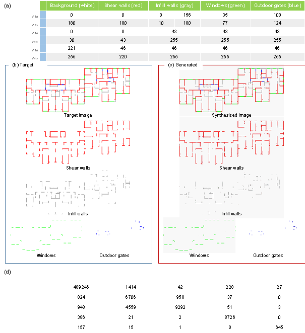 where Nex and Nnonex denote the number of experts and non-experts, respectively, and NF and NT indicate the number of misjudgments and correct judgments of StructGAN designs, respectively. Nimg is the number of assessed images, Sj is the score of image j, and ¦Çex and ¦Çnonex are the weight coefficients of the scores of experts and non-experts, respectively. ¦Òex and ¦Ònonex are the standard deviations of the scores of experts and non-experts, respectively, and ¦Ìex and ¦Ìnonex are their mean values, respectively. The determination of the weight coefficients in Equation (3) refers to the coefficient of the variation-based method proposed by Diakoulaki et al. [38], where a smaller coefficient of variation corresponds to a higher weight. Computer vision-based evaluation: the integrated consideration of the generated image quality and rationality of the structural design by StructGAN is a significant advantage of the proposed computer vision-based evaluation method. In general, the simultaneous quality evaluation of synthetic images and structural designs is challenging. This study adopted a confusion matrix [39] to assess the generation quality of critical elements in images and IoU of structural layouts to assess the rationality of the structural design. Subsequently, two methods are weighted to evaluate the comprehensive performance of StructGAN. In the confusion-matrix-based assessment (Figure 4), adopting the classification of each pixel and the correctness judgment of the pixel type to evaluate the generative quality is the core superiority. First, structural shear walls, nonstructural infill walls, indoor windows, and outdoor gates are directly distinguished and separated according to the hue saturation value (HSV) of each pixel, utilizing the Open Source Computer Vision (OpenCV) library for image processing to convert the colors into the HSV mode [40] (Figure 4a). The extracted elements of the StructGAN design are compared with those of engineers pixel-by-pixel, and then the comparison results are used to create a confusion matrix (Figures 4b and 4c). Subsequently, based on the confusion matrix, Pixel accuracy (PA), weighted IoU (WIoU), and shear wall ratio (SWratio) are proposed and used, where PA (Equation (4)) measures the image clarity, WIoU (Equation (5)) estimates the generative quality of critical elements, and SWratio (Equation (6)) reflects the total amount of structural shear walls. Owing to the above-proposed metrics derived from image pixel classification, the use of the confusion-matrix-based evaluation could measure the comprehensive quality of the generated image.