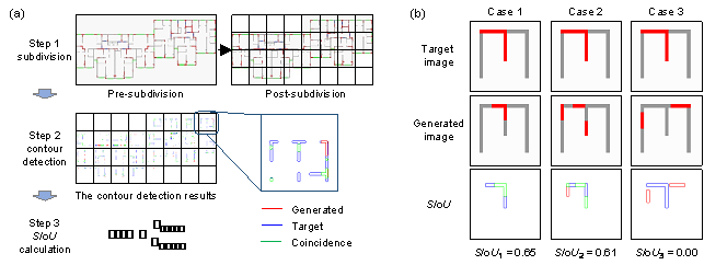 where Ainter is the intersection area of the walls in the GAN-synthetic and target designs, Aunion is the union area of the walls in the GAN-synthetic and target designs, Aunion = Atarget + AGAN − Ainter, and Atarget, and AGAN denote the shear wall area of the target design and the GAN design, respectively. Figure 5 Information on IoU-based evaluation. (a) Detailed steps to get SIoU. (b) Typical cases of SIoU.The proposed GAN-based structural design methods are yet to be mature, and so are the relevant metrics. Therefore, this study attempts to make some progress by proposing holistic metrics to conduct a more objective and integrated performance evaluation. Inferring from the above studies of single metrics, PA is the traditional pixel-by-pixel evaluation to assess the image quality, which is abandoned because of the failure to comprehend the overall structural layout. Moreover, SIoU, WIoU, and SWratio can only evaluate the confined properties of structural layouts of StructGAN. Hence, by combining the qualities of the generated critical elements in images and structural designs, this study proposed the weighted multi-metric ScoreIoU (Equation (8)) to assess the design performance comprehensively.