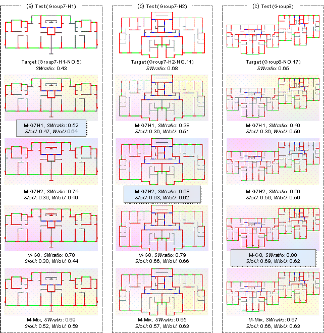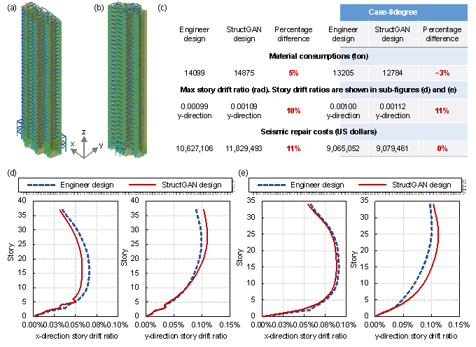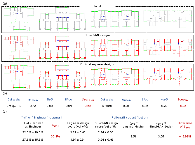 The most critical metric is ScoreIoU, with value > 0.5 denoting excellent quality. ScoreIoU = hSWratio ¡Á (hSIoU ¡Á SIoU + hWIoU ¡Á WIoU); hSWratio = 1 − |SWratioGAN − SWratiotarget| / SWratioGAN; hSIoU = hWIoU = 0.5. Additionally, the quantitative evaluation results for all structural designs are shown in Table 4, indicating that the best designs were devised by the StructGAN trained under the consistent design conditions, with the largest corresponding ScoreIoU. In addition, the design qualities of the adequately trained StructGAN under different design conditions are relatively stable, with their ScoreIoU > 0.5. Hence, the training datasets for StructGAN should be classified based on design conditions, and the design conditions of the adopted StructGAN should be matched with those of architectural sketches in a structural design application. In contrast, the designs by StructGAN with unmatched design conditions are irrational. The layouts and length of the structural shear walls in the designs by StructGAN are inconsistent with those in the designs by competent engineers, as shown in Figure 8. Furthermore, the designs developed by M-Mix are close to the average of mixed designs, not precisely satisfying the demands of different design conditions. Consequently, refined design conditions-based data classification narrows the restriction of the maximum likelihood estimation and further improves the precision performance of StructGAN. Meanwhile, the design quality evaluation results confirmed the precise and stable design performance of StructGAN. 5 STRUCTGAN PERFORMANCEThis study validated the efficiency and accuracy of the proposed StructGAN framework via discussions and analyses. The excellent design performance was obtained through the optimal algorithm, the most applicable hyperparameters, the proposed dataset split method, and rational evaluation methods. This section further demonstrates the superior performance of StructGAN by comparing it against the structural designs of competent engineers. Specifically, in the StructGAN application, the semanticization of architectural drawings requires approximately 9 min, and then the semantic drawings are input into StructGAN to generate the corresponding structural layout design, which takes approximately 30 s. Compared with the design of experienced engineers, adopting StructGAN for preliminary structural design can reduce the time consumption from 3.5 h to 10 min. Additionally, StructGAN can also improve the efficiency of the overall structural design. As an estimation of this study, time consumption can be reduced from 300 h to 30 h with ten times efficiency enhancement. Furthermore, standardizing the semanticization process of architectural drawings can shorten the time of preliminary structural design to 3 min, with higher overall design efficiency. StructGAN accelerates the entire structural design process by a factor of 10, which is equivalent to a saving of approximately 100 million USD per annum in the industry, according to the statistical estimation of this work. See Appendix B. [23] for additional estimation information. In addition to design efficiency and economics, design quality is equally critical. The comparison is performed on the drawings first, followed by an evaluation of the structural behavior. Two approaches based on computer vision and engineer perception were developed to support a comprehensive assessment. Subsequently, two overall structural designs by StructGAN and engineers are compared to show that the StructGAN designs are not only safe but also economical. The observations of similar material takeoffs and seismic resilience suggest that the structural design by StructGAN is as great as those optimized by competent engineers. 5.1 Plan drawing design performanceIn total, 16 structural design drawings by StructGAN and engineers were compared. Figure 9a illustrates four typical structural plan designs for shear wall residential buildings, depicting the high consistency between the designs by StructGAN and experienced engineers. The computer-vision-based evaluation was performed first. The quality evaluation results of structural designs by StructGAN are shown in Figure 9b. The metric ScoreIoU considers the comprehensive performance of structural design and image generation. The consistency measurement basis for ScoreIoU is the IoU, which denotes the ratio of the intersection area to the union area of structural designs by StructGAN and engineers. Previous studies indicated that an IoU > 0.5 corresponds to a high consistency [45-47]. Moreover, in the comparative study of structural plan layouts, 16 buildings were adopted as cases and divided into two groups according to their different design conditions. Thus, the ScoreIoU in Figure 9b is the average of each group, and it is higher than 0.5, indicating that the structural designs by StructGAN are comparable to those by experienced engineers and are outstanding. Furthermore, engineers were also invited to judge the ¡°AI¡± or ¡°Engineer¡± of designs and assess the rationality of StructGAN designs based on their straightforward perception. In the ¡°AI¡± or ¡°Engineer¡± judgment, engineers need to figure out the ones designed by StructGAN, and the judgment score is SEP-1. Simultaneously, in the design rationality assessment, the rationality score is SEP-2. This study invited 11 senior experts (work experience > 15 years), 12 practicing engineers, and graduate students to participate in the judgment and evaluation work. Two important conclusions can be drawn from the results shown in Figure 9c. (1) Approximately 30% of the StructGAN designs were appraised as designs by engineers, with the corresponding SEP-1 equal to 30%, which is notably better than the highest Amazon Mechanical Turk (AMT) test result of 22.5% in the pix2pix study [17]. The above result indicates that it was challenging for humans to distinguish the designs by engineers an