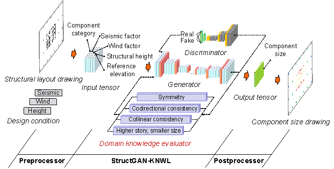 AbstractIn the schematic design phase of framed tube structures, component sizing is a vital task that requires expert experience and domain knowledge. Deep learning-based structural design methods enable machines to acquire expert experiences, but domain knowledge (e.g., empirical laws summarized by engineers from engineering practices) has not been embedded into such data-driven methods, resulting in common sense-conflicting designs. A knowledge-enhanced generative adversarial network is proposed by incorporating a novel differentiable evaluator for compliance checking of domain knowledge. A comparative study indicates that the proposed knowledge-enhanced method is 51% superior to the conventional data-driven method and 150 times faster than a competent engineer. The proposed method facilitates the schematic design of framed tube structures to be automatic and efficient, hence improving the productivity of structural engineers. This study might inspire the development of other knowledge-enhanced deep learning methods and their application in civil engineering. KeywordGenerative adversarial network; domain knowledge; expert experience; intelligent structural design; framed tube structure 1. IntroductionWith rapid urbanization worldwide, framed tube structures have increasingly popular applications in high-rise buildings. The design process of framed tube structures can be generally divided into three phases, namely the schematic design phase, detailed design phase, and construction drawing design phase. As indicated in Figure 1, the impact of decisions is quite significant during the schematic design phase because the subsequent designs are all reliant on the schematic design (Wang et al., 2002). However, the tools in that phase are scarce, because the imprecise and incomplete understanding of design requirements and constraints makes it challenging to use computer-based tools in this early phase (Hsu & Liu, 2000). Therefore, this study focuses on the schematic design phase where the greatest opportunity exists. Owing to the complexity of the structural system and lack of tools, the schematic design of framed tube structures is a difficult task that relies on expert experience and domain knowledge. Traditionally, senior engineers with adequate design experience and knowledge are responsible for manually developing schematic designs based on the layout, height, seismic risks, and wind loads, laying a foundation for subsequent design phases. The section sizes of structural components, particularly vertical components, are crucial to the schematic design. If the schematic design significantly deviates from the detailed one, the computational, labor, and time costs associated with structural optimization and adjustment will significantly increase. Ideal component section designs could be impractical in some of these circumstances. Currently, the schematic design of the component section size relies exclusively on engineers¡¯ personal experience and knowledge. It is challenging to improve working efficiency beyond human limits and pass on these experiences and knowledge to junior engineers. Therefore, an intelligent design method for component section size is desired in the schematic design phase (Figure 1), which should be capable of accumulating expert experience and mastering domain knowledge, allowing this design phase to be automatic and efficient. Figure 1 Design process of framed tube structures (modified from Wang et al. (2002))In recent years, the emerging deep learning has been providing new solutions to structural design, particularly schematic designs that rely on human experience (M¨¢laga-Chuquitaype, 2022). In terms of the schematic design of building structures, deep learning-related methods are mainly based on computer vision techniques that represent structural designs as images (Ampanavos et al., 2021; Liao et al., 2021 & 2022; Pizarro et al., 2021; Lu et al., 2022). Structural design methods based on generative adversarial networks (GANs) have made significant breakthroughs. A GAN is an advanced deep learning framework that comprises two neural networks known as a generator and a discriminator (Goodfellow et al., 2014). GANs can learn complex real-world probability distributions in a game between the generator and discriminator. After reaching Nash equilibrium, GAN can generate realistic image outputs by sampling from learned probability distributions (Newton, 2019; Qian et al., 2021; Rahbar et al., 2022). Specifically, Pizarro et al. (2021) proposed a conceptual design method for shear wall structures, combining a regression model and GAN, Liao et al. (2021 & 2022) and Lu et al. (2022) proposed GAN-based structural wall layout methods, Zhao et al. (2022) proposed a GAN-based design method for beams and slabs, and Fei et al. (2022) proposed a GAN-based shear wall structure design system. Some researchers have also proposed structural design methods based on other deep learning techniques. For example, Chang & Cheng (2020) proposed a structural optimization method based on graph neural networks, the scope of which was limited to frame structures. These studies trained deep learning models on large-scale datasets of existing structural designs, successfully accumulating expert experience to a certain extent and providing powerful tools for schematic design. However, existing methods rarely consider domain knowledge, which is crucial for both structural design and deep learning. The absence of domain knowledge results in problems, including conflicts between generated designs and the common sense of engineers and difficulty in further improving the model performance. Domain knowledge in structural design is the empirical laws summarized by engineers from engineering practices. Also known as the structural concept, it is a comprehensive reflection on aesthetics, mechanics, constructability, cost, etc. (Lin, 1988). For example, when designing the layout of shear walls, engi