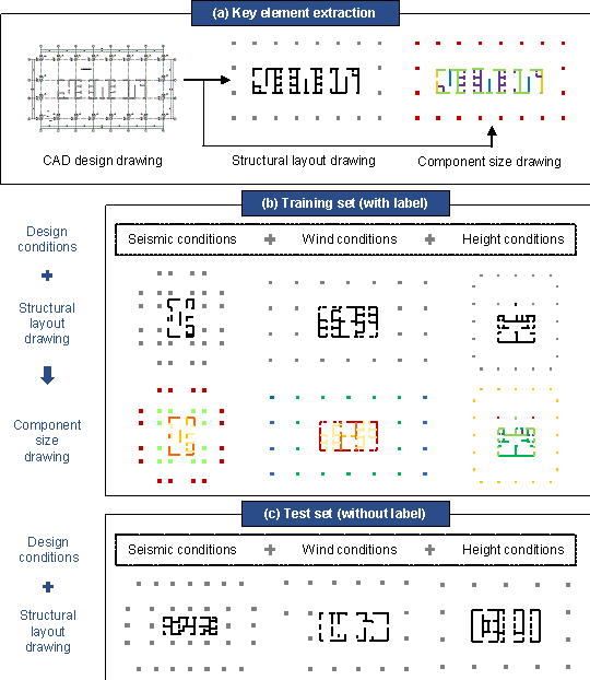 solely data-driven, and 2.3 DatasetTo enable the GAN to learn useful expert experience, a structural design dataset is established on real-world framed tube structure projects from famous architectural design institutes in China. Design information of 52 framed tube structures is collected, with 276 standard stories. These buildings are distributed across 17 provinces in China and have different seismic and wind design conditions. Their heights range from 56.7 m to 213.7 m, and their widths range from 16.0 m to 63.0 m. The collected design information includes computer-aided design (CAD) structural drawings in the DWG format and design conditions in the CSV format. Generally, a building comprises multiple standard stories, each of which has its design drawings and conditions. For design drawings, key element extraction is performed to remove unnecessary elements, thereby facilitating the training of deep learning models (Liao et al., 2021). Specifically, unnecessary information, such as axes and annotations, is removed, and only the components to be designed (frame columns and shear walls) are retained. Thus, a structural layout drawing (with only component category attributes) and a component size drawing (with additional section size attributes) can be obtained, as shown in Figure 4(a). The design conditions can be divided into three categories: seismic, wind, and height design conditions. They are further summarized into four design condition features (seismic influential factor, wind influential factor, structural height, and reference elevation), as shown in Table 1. The details of the design condition features are described in Subsection 3.2. Note that the buildings in this study have regular vertical layouts. Consequently, the standard stories of the same building share the same design condition features, except for the reference elevation. Figure 4 DatasetTable 1 Design conditions of a standard story