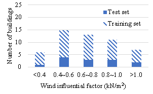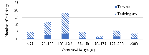 The dataset is divided into a training set and a test set in a ratio of 3:1. The training set consists of 39 buildings (with 205 standard stories) and contains structural layout drawings, design conditions, and corresponding component size drawings, as shown in Figure 4(b). The test set consists of 13 buildings (with 71 standard stories) and contains only structural layout drawings and design conditions, as shown in Figure 4(c). Note that the standard stories of the same building must not be separated into training and test sets. The seismic influential factor, wind influential factor, and structural height have similar distributions on the buildings in the training and test sets (Figure 5), indicating that the test set is representative. Furthermore, the dataset is enlarged by eight times through data augmentation (90¡ã rotation and mirroring).