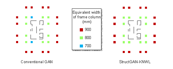 Scheme 3: For frame columns, exterior walls, and interior walls, embed corresponding domain knowledge, respectively, and train three StructGAN-KNWL models. For each category of structural component, both a planar relationship and a vertical relationship are considered, as shown in Figure 9(c). In the application stage, three categories of structural components are respectively generated by the corresponding GAN and then integrated into a complete design.
