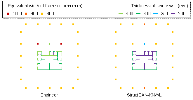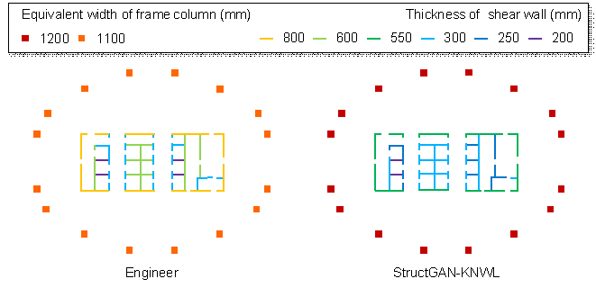 Table 6 shows that after the embedding of single domain knowledge, the loss functions corresponding to the four types of domain knowledge decrease by 38.5%, 46.9%, 43.6%, and 37.3%, respectively. The rationality of the designs is significantly improved. Typical designs before and after the embedding of domain knowledge are shown in Figure 11. StructGAN-KNWL solves the problems of the asymmetry of frame columns (Figure 11(a)), the inconsistency of the co-directional exterior walls (Figure 11(b)), the inconsistency of the collinear interior walls (Figure 11(c)), and the increase of section sizes with the elevation of the standard story (Figure 11(d)), respectively.