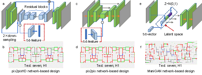where, Aswall and Ainwall are the total areas of the shear and infill walls, respectively. (k+1) is the total class (class 0 is for the background, class 1 is for the shear wall, class 2 is for the infill wall, class 3 is for the window, and class 4 is for the outdoor gate, in Figure 6b). pii represents the number of true positives, whereas pij and pji are usually interpreted as false positives and false negatives, respectively. Ainter and Aunion are the intersection area and union area of the shear walls in the GAN-synthetic and target designs, respectively. 3.3 Generative designAs shown in Figure 4, after performance evaluation, the well-trained TxtImg2Img model can be used in structural design or other engineering designs. With the simultaneous input of primary images and the corresponding design text properties, TxtImg2Img can quickly generate a design that meets the text-image guidance. Additionally, TxtImg2Img normally generates an image with a size of 512 ℅ 256 pixels, which makes it difficult to meet the high-resolution requirements of engineering design. Therefore, the super-resolution method (Li et al., 2019b; Sharma & Kumar, 2021) is recommended to improve the output image resolution up to 1024 ℅ 512 pixels. 4. Discussion of Networks and HyperparametersThis study analyzed the network architecture of image feature extraction and generation and the hyperparameters of the text encoding-feature extraction network to explore the most applicable network architecture and corresponding hyperparameters. 4.1 Network adjustmentThe TxtImg2Img generator is mainly composed of text and image feature extraction and fusion modules, and a fused feature-based image generation module. The basic network architecture used in this study for text feature extraction and fusion was relatively simple, and could be easily determined. Based on the confirmed text feature extraction and fusion network, it was necessary to determine the most appropriate network architecture for image feature extraction and new image generation. Hence, this study compared two widely used image-to-image methods, namely pix2pix (Isola et al., 2017) and pix2pixHD (Wang et al., 2018), and a text-guided image synthesis method, ManiGAN (Li et al., 2020). The pix2pix and pix2pixHD networks were combined with the text feature extraction and fusion networks under the architecture shown in Figure 7. The combined networks and ManiGAN networks, as well as the corresponding generated images, are shown in Figure 7. 1) Method A: Using pix2pixHD, the combined network shown in Figure 7a was used to fuse the high-dimensional features of images and texts and generate designs. Figure 7b shows the generated design. The generated image had a high resolution, and the corresponding shear wall structural design was reasonable (i.e., the Equation (10)-based evaluation metric ScoreIoU = 0.5086). 2) Method B: Based on the UNet networks of pix2pix, the combined networks are shown in Figure 7c, and the corresponding generated design is shown in Figure 7d. In contrast to Method A, the generated image had a low resolution, and the quantity of the designed structural shear walls was large, indicating that the text had insufficient control over design generation (ScoreIoU = 0.0644). Moreover, the pix2pix training was unstable, similar to what Wang et al. (2018) observed. 3) Method C: Figure 7e shows a typical image generation method with text guidance, that is, ManiGAN (Li et al., 2020). This method extracts the image and text features separately, flattens the features into 1D vectors, and creates a normally distributed 1D noise vector. Then, the 1D text, image, and noise vectors are stacked in a latent space. Based on the stacked 1D vector, affine transformation networks were adopted to generate the image. However, owing to the quantity limits of structural design drawings and the corresponding text properties, it is easy to generate a distorted image using the 1D vector affine transformation. As shown in Figure 7f, the generated structural design did not meet the design requirements (ScoreIoU = 0.0058). Through the analysis and application of various typical network architectures, Method A (the combination of pix2pixHD networks and text feature extraction and fusion networks) was found to perform best with image and text features fused by the Hadamard product. The detailed network architecture is illustrated in Figure 3a. Figure 7. Comparison of different basic networks and text每image fusion methods. a每b. Combination of pix2pixHD networks and text feature extraction and fusion networks, and the corresponding generated design (ScoreIoU = 0.5086). c每d. Combination of pix2pix networks and text feature extraction and fusion networks, and the corresponding generated design (ScoreIoU = 0.0644). e每f. ManiGAN networks and the corresponding structural design (ScoreIoU = 0.0058).4.2 Hyperparametric adjustment and discussionAfter determining the network architecture, it was necessary to further analyze the text encoding-feature extraction networks. First, the text encoding method for mapping simple text into float numbers was adopted. The text properties of this method are pre-extracted vital features based on domain prior knowledge. Hence, text properties used were concise keywords instead of complicated sentences, which were more suitable for simple encoding. Second, a performance analysis of the text feature extraction network was conducted. As shown in Figure 3b, the most critical hyperparameter is the number of up-sampling blocks (i.e., nusb), which corresponds to the depth of the up-sampling networks. In general, deeper networks can extract features more adequately (Krizhevsky et al., 2012). However, limited data for too deep network training can easily cause a dimensionality curse (Wikipedia, 2021), inducing the feature extraction ability to decrease. Therefore, a hyperparametric analysis is required to determine the optimal nusb. In addition, regul