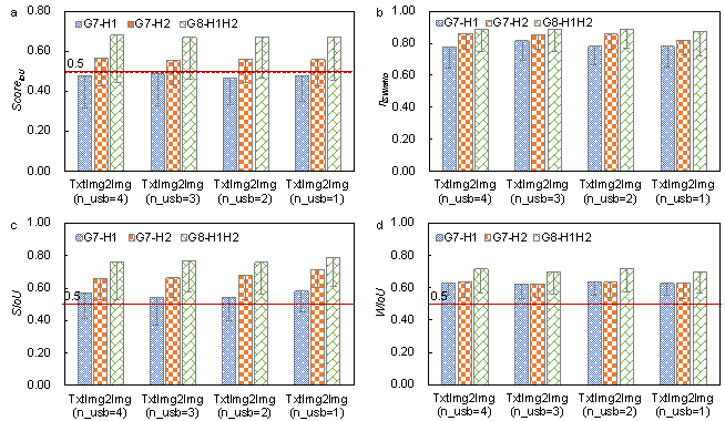 In addition, based on the hyperparameters, the complexity can be concluded. (1) For the complexity of texts and image of this study: (a) the complex of dealt texts is relatively low: the word type in TxtImg2Img is less than 10, with a total of 2000 corresponding words, which is 1/1200 of the complex model of ManiGAN (the corresponding total number of words is 2,400,000); (b) the image semantization method effectively reduces the complexity of image learning (Liao et al., 2021), and the image size is normal (i.e., 256℅512), avoiding the additional computational cost; (c) low model parameters: TxtImg2Img model has 47 million trainable parameters, the ManiGAN model has 78 million parameters (with more parameters for text feature learning than TxtImg2Img), and other well-known text-image transform algorithms, such as DALL-E, with approximately 12000 million parameters (Ramesh et al., 2021). Hence, the TxtImg2Img model is low complexity and suitable for few-shot learning. (2) Moreover, for the complexity of the optimization algorithm: This study uses the widely used Adam optimizer (Kingma & Ba, 2014), which is consistent with the pix2pixHD algorithm (Wang et al., 2018). Because the Adam optimizer has been proven useful in deep learning, no further analysis and discussion of complexity need to be conducted. 5. Design Performance of TxtImg2ImgThe analysis and comparison of studies on the network architecture and critical hyperparameters of TxtImg2Img were conducted, and the optimal network and hyperparameters were determined. In addition to the architectural-to-structural design datasets, shoe edges-to-appearance design, handbag edges-to-appearance design, and gray-to-colored bird image conversion datasets were adopted for training, testing, and evaluation to further assess the TxtImg2Img performance. Liao et al. (2021) proposed a GAN-based structural design method, namely StructGAN. pix2pixHD (Wang et al., 2018) and ManiGAN (Li et al., 2020) are typical image generation methods. In this study, the application performance of TxtImg2Img, StructGAN (Liao et al., 2021), pix2pixHD (Wang et al., 2018), and ManiGAN (Li et al., 2020) in shear wall structural design and other designs were compared. 5.1 Structural designs compared with different methodsThe shear wall structural design results are shown in Figure 9. Figure 9a shows the FID-based evaluation results of the structural design images generated using the different methods. As mentioned in Section 3.2, the FID mainly measures the authenticity and clarity of the generated image. A significant FID value indicates a significant difference between the generated and target images. The generated images of TxtImg2Img, StructGAN, and pix2pixHD were similar, and the corresponding FIDs were approximately equal to 25, which were significantly different from the FID of ManiGAN (FID = 350). Figure 9. Architectural-to-structural design performance of the different methods. a. Comparison of FID. b. Comparison of ScoreIoU. c. Comparison of typical structural designs.Table 2. Improvement in structural design performance