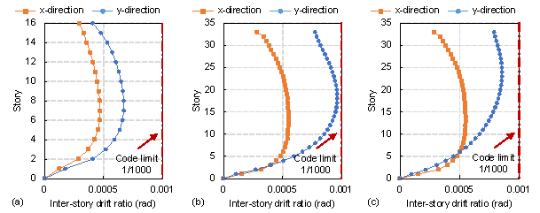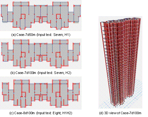 Additionally, Figure 9c shows typical generated structural design images obtained by the different methods; the ManiGAN-generated image shows significant distortion. Thus, the FID-based evaluation and typically generated images indicate that the ManiGAN-generated image had the worst structural design. Although ManiGAN performed well under training with sufficient data (nearly 100,000 of data) (Li et al., 2020), it was not easy to improve the generation quality with the dataset size limit for building structural design (approximately 220 of data). In comparison, the authenticity and clarity of the images generated using TxtImg2Img, StructGAN, and pix2pixHD were excellent. Moreover, FID primarily evaluated the image similarity only, without considering the physical meaning of pixels in the structural design. Further, the FID did not accurately evaluate the quality of the structural design. Therefore, further evaluation based on ScoreIoU was required. Figure 9b shows the ScoreIoU-based structural design evaluation results. The authenticity of the ManiGAN-generated image was unacceptable; thus, the corresponding ScoreIoU was low. The ScoreIoU using StructGAN was up to 24% higher than that of pix2pixHD (Table 1). The GAN algorithm of StructGAN is pix2pixHD, and StructGAN groups the training and test datasets according to the structural design properties. In contrast, all the structural design data were mixed and adopted for pix2pixHD training. The mixed datasets for GAN training made the learned features closer to the average characteristics of all the data. Thus, StructGAN performed better for structural designs, especially those designs with G7-H1 and G8-H1H2 properties, which was consistent with the finding of Liao et al. (2021). The ScoreIoU of TxtImg2Img was up to 21% higher than that of StructGAN (Table 1). In contrast to the StructGAN training, TxtImg2Img did not group the datasets according to the structural design properties; hence, the training data were relatively sufficient. TxtImg2Img was trained with more data and text guidance, resulting in better performance than StructGAN. Thus, TxtImg2Img showed better performance in shear wall structural design compared to other methods. 5.2 Structural designs guided by different texts Figure 10 Structural designs guided by different textsSubsequently, this study carried out the overall structural design and analyzed the corresponding overall structural performance based on the designs in Figure 10. The overall structure modeling and analysis methods refer to StructGAN (Liao et al., 2021) and StructGAN-PHY (Lu et al., 2022), where the determination of wall thickness is from StructGAN-PHY (Lu et al., 2022), and engineers design other components (i.e., beam and plate). The design cases are named Case-7d50m, Case-7d100m, and Case-8d100m, based on their design conditions (i.e., 7-degree seismic design intensity and 50 m structural height, 7-degree and 100 m, and 8-degree and 100 m), respectively. Typical plans and 3D views of ETABS mechanical models are shown in Figure 11. Furthermore, the structural dynamic characteristics and performance under seismic load are analyzed, and the corresponding results are shown in Table 3 and Figure 11, respectively. Figure 11 ETABS structural design modelTable 3 Structural dynamic characteristics and mechanical response