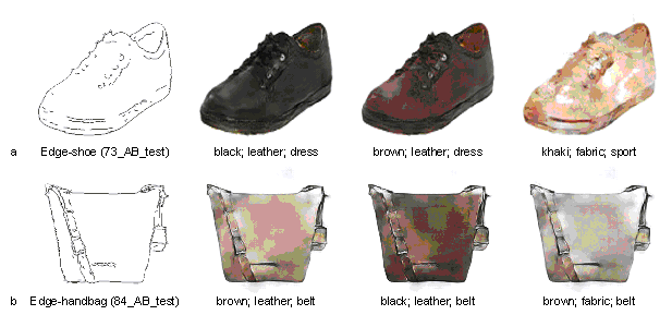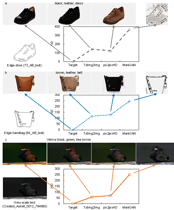 3. TxtImg2Img Implementation Figure 4. TxtImg2Img application steps: training, evaluation, and generative design.The TxtImg2Img method can be adopted not only for designing structures of shear walls but also for the appearance of shoes and handbags. It is composed of three main steps (Figure 4): 1) establishment of training and test datasets and training of TxtImg2Img, 2) testing and evaluation of TxtImg2Img, and 3) generative design using the well-trained TxtImg2Img. 3.1 Datasets and TxtImg2Img trainingEstablishing datasets for TxtImg2Img training and testing is the basic step in the application process. This method is primarily used for structural design. In addition, this study also tested the universal applicability of TxtImg2Img in other engineering and industrial designs. Note that no building-related open-access datasets are available for generative design, so designing appearances of shoes and handbags, and coloring of gray images are selected as the supplementary datasets. Four datasets were established, namely, architectural-to-structural design (original image data from Liao et al. (2021)), shoe edges-to-appearance design (original image data from Isola et al. (2017)), handbag edges-to-appearance design (original image data from Isola et al. (2017)), gray-to-colored bird image conversion (original image data from Wah et al. (2011)). Based on the raw image data (without the corresponding text property), this study created suitable text descriptions for all labeled images. The labeled images were used to generate target images with the corresponding text properties. Typical data for the four different types of datasets are shown in Figure 5. Figure 5. Typical images and the corresponding text properties (image size = 512 ℅ 256). a. architectural-to-structural design datasets (224 training and 24 test data). b. gray-to-colored bird image conversion datasets (588 training and 141 test data). c. shoe edges-to-appearance design datasets (600 training and 150 test data). d. handbag edges-to-appearance design datasets (600 training and 150 test data).Figure 5a shows a typical architectural-to-structural design dataset, with 224 training data and 24 test data. In the study of Liao et al. (2021), all raw data (i.e., architectural drawings and the structural design drawings of ground truth) were collected from more than ten famous architectural design and research institutes in China, to ensure the quality of the source design. Moreover, these designs satisfied all relevant design specifications, were optimized and evaluated by experienced engineers, and were adopted in real-world construction applications with excellent quality. Based on the raw drawings, the semantic process was adopted to extract critical elements of raw drawings and enhance training performance, where semanticization is to extract essential architectural and structural elements in design images and code them by color patterns. The images in Figure 5a are typical semantic drawings, and more detailed datasets can be found in the study of Liao et al. (2021). The seismic design intensity and structural height determine the structural design requirements of a shear wall building (Qian et al., 2018). Liao et al. (2021) further grouped the training and test datasets according to the aforementioned two critical factors. Moreover, the classification metrics of the factors were derived from the Chinese Code for Seismic Design of Buildings (GB50011-2010, 2010). Consequently, three groups of datasets were established: Group7-H1 (63 training data, 8 test data), Group7-H2 (80 training data, 8 test data), and Group8-H1H2 (81 training data, 8 test data). Here, Group7 and Group8 denote seismic design intensities of 7-degree and 8-degree, respectively. The corresponding peak ground accelerations (PGAs) of the design-based earthquake (DBE, the exceedance probability in 50 years of the DBE is 10%) are 100 cm/s2 and 200 cm/s2 in the 7-degree and 8-degree seismic intensity zones, respectively. H1, H2, and H1H2 denote structural heights of < 50 m, 50每150 m, and 0每150 m, respectively. In the 8-degree seismic intensity zones, the high seismic design intensity dominates the demands for structural seismic resistance, whereas the structural heights slightly influence those demands; thus, the designs in the 8-degree seismic intensity zones were not grouped by structural heights. Based on the image datasets of Liao et al. (2021), this study merged different grouped datasets and added text properties of images according to the original group names. As shown in Figure 5a, the text property ※eight§ denotes that the seismic design intensity is 8-degree; ※H1H2§ denotes the structural height attribute. The text properties of the other datasets were similar to those of the architectural-to-structural design datasets shown in Figure 5a. The gray-to-colored bird image conversion datasets included four text properties, as shown in Figure 5b: bird head color (white), body color (dark), 1st background color (water blue), and 2nd background color (sky gray). The shoe edges-to-appearance design datasets included three text properties, as shown in Figure 5c: shoe color (dark brown), material (leather), and style (dress). The handbag edges-to-appearance design datasets included three text properties, as shown in Figure 5d: handbag color (cream), material (leather), and belt or none (belt). Using the datasets, the training and testing of TxtImg2Img and the critical hyperparametric analysis were carried out. More detailed training and analysis of TxtImg2Img are presented in Section 4. 3.2 Evaluation and metricsStudies on rational generation evaluation methods are critical and challenging for GANs. At present, Fr谷chet inception distance (FID) is a highly accepted evaluation method that is applicable to most image generation quality evaluations (Heusel et al., 2017). In the FID-based evaluation method shown in Figure 6a, a high-dimensional image featur