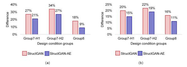 where, SWratio represents the shear wall ratio; SWratioGAN and SWratiotarget represent the shear wall ratio of GAN’s design and target design, respectively, calculated using the ratio of the shear wall area Aswall and the sum of shear wall area Aswall and infill wall area Ainwall in the design result; SIoU is the IoU of shear walls; ASWinter is the shear wall intersection area of GAN’s design and target design, and ASWunion is the shear wall union area where ASWunion = ASWtarget + ASWGAN − ASWinter; ASWtarget and ASWGAN are shear wall areas for target design and GAN’s design, respectively; WIoU is the weighted IoU; (k+1) is the class number, and this study focused on 5 classes (class 0 represents the background, class 1 represents the shear wall, class 2 represents the infill wall, class 3 represents the window and door, and class 4 represents the outdoor gates); pij is the pixel that belongs to class i but is predicted to be in class j; w0=0, w1=0.4, w2=0.4, w3=0.1, and w4=0.1; ηSWratio denotes the correction coefficient for the overall quantity of shear walls; ηSIoU and ηWIoU are the weight coefficients of SIoU and WIoU, respectively, and both are 0.5. Previous studies have shown that IoU > 0.5, indicating that the neural network results were highly consistent with the target value [50-52]. ScoreIoU is a weighted indicator based on IoU metrics, and a ScoreIoU greater than 0.5 indicates that the design results are of high quality [19]. This study compared the performance of StructGAN and StructGAN-AE, as shown in Table 2. In addition to the comprehensive evaluation metric ScoreIoU, the SIoU and 1−ηSWratio metrics are important. SIoU is the IoU of shear walls and represents the similarity between the shear wall layouts designed by the AI and engineers. 1−ηSWratio represents the difference in the shear wall ratio between the designs by the AI and engineers. Generally, larger ScoreIoU and SIoU, and smaller 1−ηSWratio are preferred. As shown in Table 2, for Group7-H1, the ScoreIoU of StructGAN-AA-PT (0.52) was the best, which was 30% higher than that of StructGAN (0.40) and exceeded 0.5. For Group7-H2 and Group8, the optimal model was StructGAN-SA-PT, and ScoreIoU was improved by 0.05 compared with StructGAN. For Group7-H2, ScoreIoU of StructGAN-SA-PT (0.57) was 9.6% greater than that of StructGAN (0.52). For Group8, ScoreIoU of StructGAN-SA-PT (0.70) was 7.7% greater than that of StructGAN (0.65). The combination of attention-enhancing and pre-training methods exhibited the best performance. ScoreIoU values of the two attention-enhanced StructGAN models with the pre-training method (i.e., StructGAN-SA-PT and StructGAN-AA-PT) were the two highest in each design condition group, as shown in Table 2. Table 2 Comparison of metrics of StructGAN-AE and StructGAN