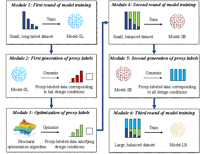 (3) The application on the shear-wall layout task reveals that, compared with the conventional supervised learning method, the proposed method can improve the design performance on the tail design conditions by 11.6% and reduce the performance difference between the head and tail design conditions by 21.3%.