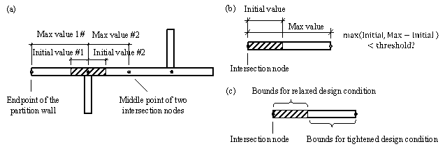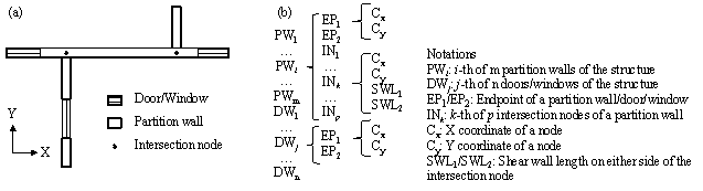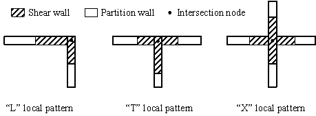 where The dataset is collected as described in Section 3.1, and the key parameters used in the experiment are given in Section 4.1. After the training, the model is evaluated using the metrics given in Section 4.2. More details can be referred to [22]. Note that StructGAN-TXT is effective for the shear-wall layout task concerned in this study. For other design tasks, appropriate ML models should be selected considering the specific characteristics of the given problems. 3.3 Structural optimization based on a two-stage evaluation strategy and empirical design rulesTo optimize the proxy labels (i.e., Module 3 in Figure 2), a shear-wall layout optimization procedure is developed based on a two-stage evaluation strategy and the previously established empirical design rules, as shown in Figure 6. The optimization variables are the shear-wall lengths (see step ¢Û below) and the optimization objective is to satisfy the structural requirements (i.e., inter-story drift under earthquakes) whilst consuming the minimum amount of materials (i.e., concrete). This optimization procedure is compatible with the input and output of StructGAN-TXT, enabling the automatic and efficient optimization of shear‑wall layouts. The detailed step-by-step procedure is described as follows. Figure 6. Structural optimization based on a two-stage evaluation strategy and empirical design rules¢Ù Extract vectorized data The raw proxy labels generated by StructGAN-TXT are structural pixel images, where the shear walls are represented by red (RGB = (255, 0, 0)) pixels. The planar coordinates of the shear walls are obtained using a shear-wall extraction method based on computer vision and building information [23]. Firstly, the red pixels are stripped and binarized, and the noises are removed. Then, the endpoints of shear walls are identified as the intersection points between the axis of the partition wall and the contour of the shear-wall pixels. ¢Ú Establish structured data The structured data are established based on the planar coordinates of key components, as shown in Figure 7. The first level of structured data comprises architectural components, including partition walls, doors, and windows. The second level comprises nodes, including the endpoints of partition walls, doors, and windows, and the intersection nodes of partition walls in the X and Y directions. The third level comprises the node coordinates and shear-wall lengths on both sides of the intersection nodes. The shear-wall lengths are defined according to the coordinates obtained in step ¢Ù. A shear wall is moved to the nearest intersection node if it does not run over any intersection nodes. Figure 7. Illustration of the structured data. (a) Intersection node; (b) Relationship of three levels.It can be found that these structured data allow the shear walls to be automatically grouped into local patterns in the form of "L", "T", and "X" shapes based on the locations of the intersection nodes, as shown in Figure 8. Two shear walls in the orthogonal directions that make up the local pattern will deform together, which is beneficial to the overall structural performance of the shear-wall structure. Furthermore, the local patterns can facilitate construction and reduce formwork costs, thereby improving constructability. Figure 8. Local patterns of shear-wall layout¢Û Initialize optimization variables Based on the structured data, the shear-wall lengths on both sides of the intersection nodes are defined as the optimization variables. The lower bound (minimum value) of the variables is 0. The upper bound (maximum value) is (i) the distance from the intersection node to the endpoint of the partition wall or (ii) the distance from the intersection node to the midpoint of two intersection nodes, as shown in Figure 9(a). The increment of the variables should be defined according to the accuracy requirements, which can generally be taken as 250 mm. The initial value of the variables is defined according to the current shear-wall length. There are three ways to reduce the possible combinations of variables, thereby accelerating convergence: (1) Consider symmetry: In most cases, shear-wall structures of residential buildings are symmetrical along either the X or Y direction, as illustrated in Figure 4. If two intersection nodes are symmetrical along the X or Y direction and their variable bounds are identical, then the variables are shared by the two nodes. Note that the variables will not be merged for asymmetrical cases. (2) Consider the optimization