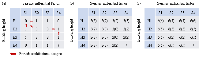 Module 2: First generation of proxy labels The first-generation proxy labels are used to form a balanced dataset, and therefore, should correspond to tail design‑condition combinations. For a given tail design‑condition combination, the seismic influential factor and the building height of the proxy label are randomly selected within its design‑condition class. Then, the architectural designs of the proxy labels are shared with the adjacent design‑condition combinations. A typical case is illustrated in Figure 10(a). Finally, 25 sets of inputs (i.e., architectural design and design conditions) are constructed, and the corresponding proxy labels are generated using Model-SL. Since Model-SL is biased, the above proxy labels are biased towards their original design conditions and cannot fully satisfy the new design conditions. Note that if additional architectural designs are available, they can be used directly without adopting the sharing strategy shown in Figure 10(a). Otherwise, when choosing adjacent design condition combinations, it is preferable that the optimization tendency can be determined so that the variable bounds can be narrowed to accelerate convergence, as specified in Section 3.3, Step ¢Û. When generating proxy labels, the combination of S4 and H4 is not considered, as it is not possible for them to coexist [10]. Figure 10. Distribution of proxy-labeled data. (a) Sharing of architectural designs; (b) Small, balanced dataset; (c) Large, balanced dataset (in parentheses are the numbers of proxy-labeled data)Module 3: Optimization of proxy labels The generated proxy labels are optimized using the proposed structural optimization procedure. For the genetic algorithm, an iteration number of 20 and a population size of 10 are used so that the time consumption is acceptable. Notably, the proposed structural optimization procedure can obtain satisfactory results with a smaller iteration number and population size than the conventional method by incorporating a two-stage evaluation strategy and empirical design rules. Other parameters are set as follows: the crossover probability is 0.9, the distribution index is 20 for both crossover and mutation operators, and the mutation probability is the inverse of the number of variables [44]. Depending on the complexity of the shear‑wall structures, the time consumption for each design varies from 1 h to 12 h. The optimization results are listed in Table 3, which are in line with expectations: the total length of the shear walls decreases in cases where the design conditions are either relaxed or unchanged, or increases in cases where the design conditions are either tightened or unchanged. For the cases where one design condition is relaxed and the other tightened, the change in the total shear‑wall length is minor. Note that the ¡°Undetermined¡± class in optimization tendency should be minimized. Table 3 also lists the number of variables before and after adopting the reduction strategy proposed in Section 3.3, Step ¢Û. On average, the number of variables is reduced by 81% after considering three ways to decrease the possible combinations of variables. Table 3. Optimization results and variable numbers of proxy labels