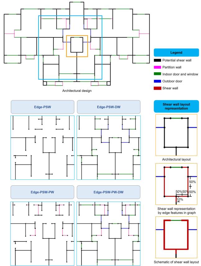 where PNinter is the number of intersection pixels between the shear wall design result generated by the GNN model and the ground-truth shear wall design result; PNunion is the pixel number in the union of the shear wall design result generated by the GNN model and the ground-truth shear wall design result; PNGNN is the total pixel number of the shear wall designed by the GNN model; PNgt is the total pixel number of the ground-truth shear wall design result. Figure 6 Schematic of the evaluation method of design results. (a) The mapping method of shear wall layout designs on pixel images. (b) IoU of ground-truth and GNN-based shear wall design results. Ten-fold cross-validation is performed for each model during training. Subsequently, the validation-set average and standard deviation of IoUpixel obtained from the ten-fold training sessions are used as specific evaluation indicators to evaluate the different graph representation methods and GNN models. The closeness of IoUpixel to 1 implies the closeness of the shear wall designed by the GNN-based method to the design by engineers and the high performance of the GNN-based method. In the subsequent discussion, the Group7-H1 design condition group is taken as a representative to compare the performances of the different shear-wall graph representation methods and GNN models. 5.2. Results of Graph Edge Representation MethodsThe generation of a shear wall layout scheme using the developed method takes <1 s on a personal computer (i7-9700K CPU, NVIDIA GeForce GTX 1080 Ti GPU), which is efficient. The design results of a structural case using the GNN-EP-4 model are shown in Figure 7 as a representative. It can be seen that the design results based on the graph edge representation methods have good continuity and can well design the topological characteristics of the elevator shaft area. Figure 7 Design results of graph edge representation methods Table 4 reports the evaluation results of the graph edge representation methods for shear wall structures and the GNN-EP models, i.e., 6 GNN-EP models × 4 graph representations, leading to a total of 24 results. (1) GNN-EP-4 performs the best. This is because both batch normalization and dropout methods are adopted in GNN-EP-4. Their simultaneous application effectively avoids the problem of gradient explosion or gradient disappearance, thereby improving the training process stability. Moreover, the GNN layer number of GNN-EP-4 is smaller than those of the other GNN-EP models, which makes it easier to avoid overfitting owing to the limited shear wall samples. (2) The highest evaluation indicators of the four graph edge representation methods using GNN-EP-4 are relatively similar. Specifically, the evaluation indicator of Edge-PSW-DW is higher than that of Edge-PSW, and the evaluation indicator of Edge-PSW-PW-DW is higher than that of Edge-PSW-PW. Therefore, the graph edge representation methods considering doors and windows are slightly better than those not including doors and windows. (3) The evaluation indicators of the four graph-edge representation methods with GNN-EP-4 are higher than 0.5. According to the shear wall layout design research of Liao et al. [10] and Zhao et al. [33], a similarity indicator based on IoU metrics greater than 0.5 indicates that the design results are of high quality. Therefore, these graph edge representation methods are suitable for representing shear wall structures. Table 4 Results of graph edge representation methods