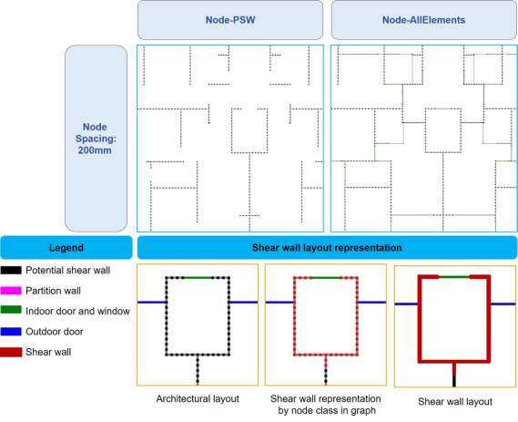 Note: xn and yn are node coordinates, xleft and yleft are node coordinates at one end of edge, xright and yright are node coordinates at other end of edge, and length is length of edge. 4.2. Graph Node Representation Methods for Shear Wall StructuresThe graph node representation methods for shear wall structures use graph nodes to represent their structural and nonstructural components (such as walls, doors, and windows) and only graph edges to represent the connection relationships between the graph nodes. Figure 4 shows a schematic of the graph node representation methods, which represent the structures shown in Figure 2. The representation of a shear wall layout is realized by predicting whether a PSW graph node belongs to a shear wall class in the graph node representation method. Figure 4 Graph node representation methods for shear wall layouts Six graph node representation methods are examined. The parameters in Figure 4 are as follows. (1) Node-PSW: Only PSWs are included in a graph. (2) Node-All Elements: PSWs, PWs, doors, and windows are included in a graph. Only PSWs are represented by graph nodes, and PWs, doors, and windows are represented by graph edges. (3) Node Spacing: Node spacing is the spacing of nodes used to represent PSWs. Three scenarios of 50 mm, 100 mm, and 200 mm are investigated. LnodeSpacing is used to represent the node spacing. A PSW of length LPSW is equally divided into Nspacing parts to arrange the nodes, as expressed in Equation (2).