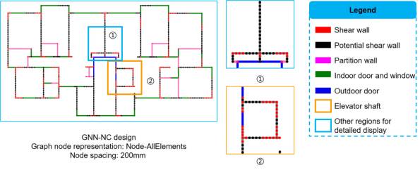 Overall, the evaluation results of Edge-PSW, Edge-PSW-DW, Edge-PSW-PW, and Edge-PSW-PW-DW are similar, showing that considering PWs, doors, and windows has little effect on the results. From the average performances of the different design condition groups, Edge-PSW-DW exhibits the best performance. In addition, based on the average results of the different design condition groups, Edge-PSW-DW is better than Edge-PSW, and Edge-PSW-PW-DW is better than Edge-PSW-PW; these trends are consistent with the conclusions presented in Section 5.2. 6.2. Comparison with StructGAN Designs6.2.1 Computational ResourceWhen the training batch size is 4, a GPU with at least 20 GB of memory is required to train the pixel-image-based StructGAN model [10]. In contrast, only 0.7 GB of GPU memory is required for all GNN models in this study. Therefore, in contrast to the pixel convolution-based deep neural network method, the proposed GNN method significantly reduces computational resources. 6.2.2. Shear Wall Layout DesignFigure 9 shows the differences in the shear wall layouts on pixel images obtained from the typical results designed by the developed GNN-EP-4 model and those designed by the StructGAN model proposed by Liao et al. [10]. One building is designed under a seismic design intensity of 7° (Group7), and another is designed under that of 8° (Group8). The results show that the shear wall layout designed using the developed GNN-EP-4 model is comparable to the design of engineers. Moreover, it provides good shear wall layouts in the elevator shaft (zone ④ of Group7 and zone ③ of Group8 in Figure 9) and balcony (zone ① of Group7 and zones ① and ② of Group8 in Figure 9) areas. Figure 9 Design results of cases of Group7 and Group8 6.2.3. Mechanical Performance and Material ConsumptionThree cases are selected from each of Group7-H1, Group7-H2, and Group8 for a detailed analysis of the mechanical performance and the material consumption. Except for the shear walls, the layout and dimensions of the beams and slabs are designed based on the study by Zhao et al. [33]. The design results of engineers, StructGAN, and the developed GNN-EP-4 model are presented in detail in Appendix B. Figure 10 compares the mechanical performance and material consumption of the StructGAN and GNN-EP model design results with the design of engineers. The GNN-EP model and StructGAN designs have similar torsional period ratio differences. However, in terms of the remaining indicators (i.e., the maximum inter-story drift ratio, first three natural vibration periods, concrete consumption, and steel consumption), the design results of the GNN-EP model are much closer to the design of engineers than those of StructGAN. Thus, the GNN-EP model can better learn the characteristics of the design of engineers from the design drawing dataset than StructGAN, leading to design results that are more similar to those of engineers. Figure 10 Difference in mechanical prosperities and material consumption of typical cases of Group7-H1, Group7-H2 and Group8 between design results of neural network models and those of engineers. It should be noted that this research aims to ensure that the artificial intelligence design results are maximally similar to the designs of engineers. This is because the engineering design drawings used in this study are real-world practical engineering design solutions, which are fine in themselves. The future research can include a priori optimized variants of these design results, for instance, using optimization algorithms that can fully consider factors such as structural performance and construction cost. 7. ConclusionThis study develops a GNN-based intelligent design method for shear wall layouts. GNN models are trained using a data-augmented dataset of predefined shear wall structures. Graph representation methods and GNN models for shear wall structures are examined and validated. By inputting the architectural design graph of the shear wall structure to be designed, the well-trained GNN models can generate a shear wall layout design comparable to the design of engineers. The detailed conclusions are as follows. (1) The established graph edge representation method is better than the graph node representation method for shear wall structures. The edge feature prediction GNN model, GNN-EP-4, is the optimal GNN model, which has the highest score in all graph edge representation scenarios. (2) The case studies show that the four graph edge representation methods for shear wall structures have similar performances, and the optimal method is Edge-PSW-DW. Therefore, PSWs are necessary for graph representation in a GNN-based shear wall structural design. In practical applications, using Edge-PSW-DW with the edge feature prediction GNN model, GNN-EP-4, is recommended. (3) The case studies show that the developed GNN-EP model has a mechanical performance and material consumption that are closer to the design results of engineers than those of the StructGAN method based on pixel images. Declaration of Competing InterestThe authors declare that they have no known competing financial interests or personal relationships that could have appeared to influence the work reported in this paper. AcknowledgmentsAppendicesAppendix AAs a supplementary exploration of the graph edge representation methods, graph node representation methods for shear wall structures are examined. In the latter, a shear wall layout design is abstracted as a node classification problem in the GNN model, as shown in Figure A.1(a). Eight GNN models with different hyperparameters, namely GNN-node classification (GNN-NC), as shown in Figure A.1(b) are studied. Similar to the GNN-EP models, the GNN-NC-1–GNN-NC-6 models are combinations of a GNN and an MLP network. Models GNN-NC-7 and GNN-NC-8 contain only the GNN. The definitions of SFLayer(), Linear(), BatchNorm(), Dropout(), p, D_in, and D_out in Figure A.1(b) are the same as those provided in Table 3