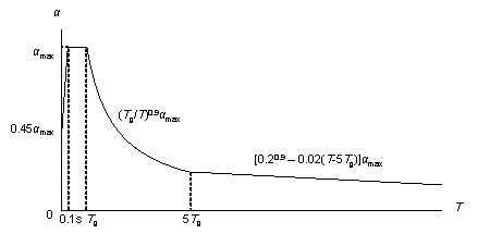 Note: xn and yn represent the coordinates of a node; xleft and yleft denote the coordinates of one end of an edge; xright and yright denote the coordinates of the other end of the edge; length represents the edge length [3]. 3.2. Feature Representations for Design ConditionsThe PGA of the DBE, characteristic ground period, and building height are the three essential parameters affecting the structural design results in the Chinese code for seismic design of buildings [26]. Figure 4 presents an illustrative representation of the seismic design response spectrum in the Chinese code for seismic design of buildings [26]. In Figure 4, 汐 represents the spectral acceleration; 汐max denotes the maximum value of the spectral acceleration; Tg represents the characteristic ground period; and T represents the natural vibration period of the structure. This study considers the Chinese code for seismic design of buildings [26] and insights by experienced engineers, emphasizing the significance of the three essential parameters (i.e., the PGA of the DBE, characteristic ground period, and building height) in structural seismic design. The shear wall is the main component that resists lateral force in the shear wall structure and is critical in the seismic design. Therefore, in the design of shear wall structures, the seismic requirement significantly influences the shear wall layouts. The seismic design response spectrum and the structural properties are the critical bases for the seismic design of the shear wall structure. The three design conditions (i.e., the PGA of the DBE, characteristic ground period, and building height) that this study focuses on are highly related to the seismic design response spectrum and the structural properties. First, the PGA of the DBE directly affects the maximum value of the spectral acceleration 汐max during the structural design. Second, the characteristic ground period, Tg, significantly affects the shape of the seismic design response spectrum during the structural design. Finally, the building height plays a crucial role in determining the natural vibration period T of the structure. These parameters are essential in structural seismic design because they form the foundation for establishing the natural vibration period of a structure and the seismic design response spectrum. The coupling of the three design conditions will directly determine the seismic lateral force suffered by the shear wall structure during the aseismic design, thus affecting the design result. Generally, the greater the seismic lateral force suffered by the shear wall structure in the seismic design, the more shear walls tend to be arranged in the structure so that the shear wall structure can meet design code requirements in the seismic response. To consider their influence on the shear wall layout design, this study incorporates the PGA of the DBE, characteristic ground period, and building height into the node and edge features of the graph representation for shear wall structures. Figure 4 Seismic design response spectrum in Chinese code for seismic design of buildings at a damping ratio of 0.05 [26]. The PGA of the DBE is related to the seismic intensity. The shear wall structure data collected in this study include seismic intensities of 6∼, 7∼, 7.5∼, and 8∼, with corresponding PGAs of the DBE 50, 100, 150, and 200 cm/s2, respectively. Therefore, in this study, the PGA of the DBE is normalized by 200 cm/s2, as shown in Equation (1).