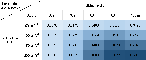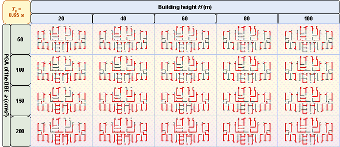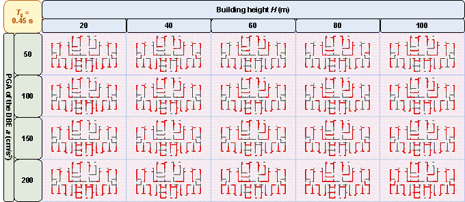 where PNsw is the pixel number of the shear wall of the GNN-designed shear wall layout and PNwall is the pixel number of the PSWs in the shear wall structure. Figure 10 demonstrates that the proposed design-condition-informed method enables a better understanding of the shear wall layout variations with respect to the design conditions. Specifically, under identical building heights and characteristic ground periods, the shear wall ratio tends to increase with an increase in the PGA values of the DBE. The PGA of the DBE directly influences the maximum value of the spectral acceleration during the shear wall structure design, consequently impacting the lateral load of the seismic design. Because the shear wall plays a vital role in resisting the lateral forces in a shear wall structure, an increase in the lateral load during seismic design results in more shear walls. Under a constant PGA of the DBE, the shear wall ratio exhibits an initial increase, followed by a slight decrease with an increase in the building height. According to the Chinese code for seismic design of buildings [26], when the structural natural vibration period is greater than the characteristic ground period Tg, the spectral acceleration of the seismic design response spectrum gradually decreases, as shown in Figure 4. For the same architectural layout, an increase in height often corresponds to a longer natural vibration period. For lower structural heights, the period is smaller, and height increment results in an increased vertical load. Consequently, as the height increases, the shear wall ratio generally increases to withstand the vertical gravity load. However, when the structure is high, the horizontal load becomes the control load for the shear walls. A longer natural vibration period reduces the spectral acceleration of the seismic design response spectrum, thereby reducing the lateral seismic force. Consequently, the shear wall ratio decreases with a decrease in spectral acceleration. As the characteristic ground period increases, the shear wall ratio increases. As the characteristic ground period increases, the corresponding period value (the characteristic ground period Tg at which the spectral acceleration value in the seismic design response spectrum decreases) increases, as shown in Figure 4. In scenes with longer characteristic ground periods, structures with the same natural vibration period are more likely to experience higher spectral acceleration than those with smaller characteristic ground periods. Consequently, when the characteristic ground period is extended, engineers tend to arrange more shear walls to enhance the seismic resistance. (a) (b) (c) (d) (e) (f) (g) (h) Figure 10 Shear wall ratios under various combinations of design conditions with characteristic ground periods of (a) 0.30 s, (b) 0.35 s, (c) 0.40 s, (d) 0.45 s, (e) 0.50 s, (f) 0.55 s, (g) 0.60 s, and (h) 0.65 s. Figure 11 shows the GNN-based shear wall layouts under various combinations of design conditions corresponding to Figures 10c and 10d with specific cases. The results of shear wall layouts corresponding to the remaining cases in Figure 10 (Figures 10a-10b and Figures 10e-10h) are supplemented in Figure B.1 in Appendix B. (a) (b) Figure 11 Shear wall layouts of one case under