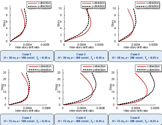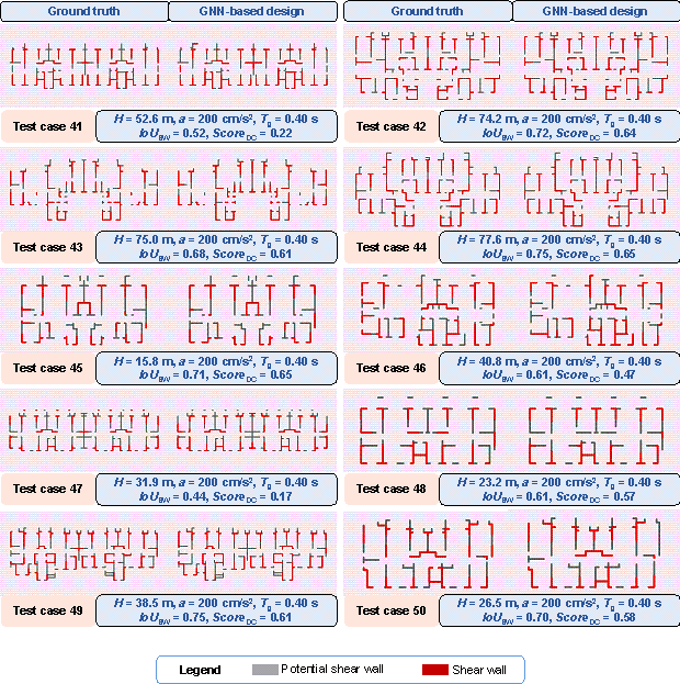 various combinations of design conditions corresponding to Furthermore, Figure 12, taking 3 m as the change step of structure height, shows the influence of small changes in structure height on the average shear wall ratios of all test-set results under the scenario of the PGA of the DBE of 100 cm/s2 and the characteristic ground period of 0.45 s. In the case where the PGA of the DBE is 100 cm/s2 and the characteristic ground period is 0.45 s, the shear wall ratio increases with the increase of building height when the building height is less than 80 m, and the shear wall ratio decreases with the increase of building height when the building height is greater than 80 m. This trend is consistent with that shown in Figure 10d. Figures 10-12 and B.1 show that the shear wall layout designed by the proposed GNN-based method is highly related to the design conditions, and the quantitative characteristics of the shear wall layout can change sensitively with the design conditions. Figure 12 Variation of the average shear wall ratios of all test-set results with the structure height under the scenario of the PGA of the DBE of 100 cm/s2 and the characteristic ground period of 0.45 s. 4.2.5. Design Results of Test-Set CasesFigure 13 shows the design results of shear wall layouts for 10 cases in the test set, and the remaining 40 test-set cases are shown in Figure C.1 in Appendix C. It can be seen from Figure 13 and Figure C.1 that the test set includes a variety of architectural layouts and design condition combinations, and the proposed method in this study can better capture the shear wall layouts. Therefore, the proposed method is general to various architectural layouts and design condition combinations. Figure 13 Design results of test cases 1每10. 5. Case StudiesUsing a test case as an illustration, Figure 14 presents the shear wall layout design results for the same architectural configuration under different design conditions and the corresponding shear wall ratio (swtotal) values. For convenience, only the shear walls and PSWs are shown in Figure 14, wherein the number of shear walls in the layout exhibits substantial variations under different design conditions. Moreover, the variation pattern of the shear wall ratio swtotal is consistent with that shown in Figure 10. Figure 14 Shear wall layouts of one case under different design conditions. The method proposed by Zhao et al. [28] is used to arrange the beam and slab of the shear wall structure, followed by mechanical analysis and preliminary design. The floor height is 3 m. Subsequently, this study analyses the inter-story drift ratios of the cases depicted in Figure 14 under earthquake action, as illustrated in Figure 15. Figure 16 shows the vertical displacements of the typical floor slabs of the cases under gravity load. Table 2 presents the natural vibration periods, torsional period ratio (the ratio of the first torsional natural vibration period and the first translational natural vibration period), maximum inter-story drift ratios, total masses, and concrete and steel material consumptions. Figure 15, Figure 16, and Table 2 show that the structural properties are highly related to the shear wall layout. Notably, all the design results exhibit maximum inter-story drift ratios below the design limit of 0.001 [26], thus fulfilling the design requirements of the specifications. The torsional period ratio is an important index to control the torsional effect of the structure, and Table 2 shows that the torsional period ratios of the cases are below the design limit of 0.9 [26, 29]. It can be observed from Cases 1, 3, and 5 presented in Table 2 that an increase in the shear wall ratio leads to increased total mass and material consumption, accompanied by a reduction in the natural vibration period. The same conclusion can be drawn from Cases 2, 4, and 6 presented in Table 2. Figure 15 Inter-story drift ratios of cases under different design conditions. Figure 16 Vertical typical-floor-slab displacement cloud diagrams of cases under different design conditions. Table 2 Some structural characteristics of cases under different design conditions
