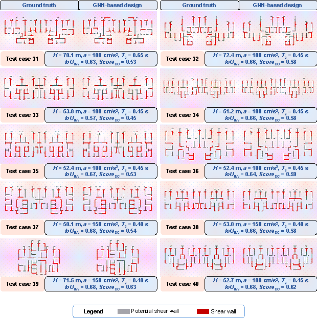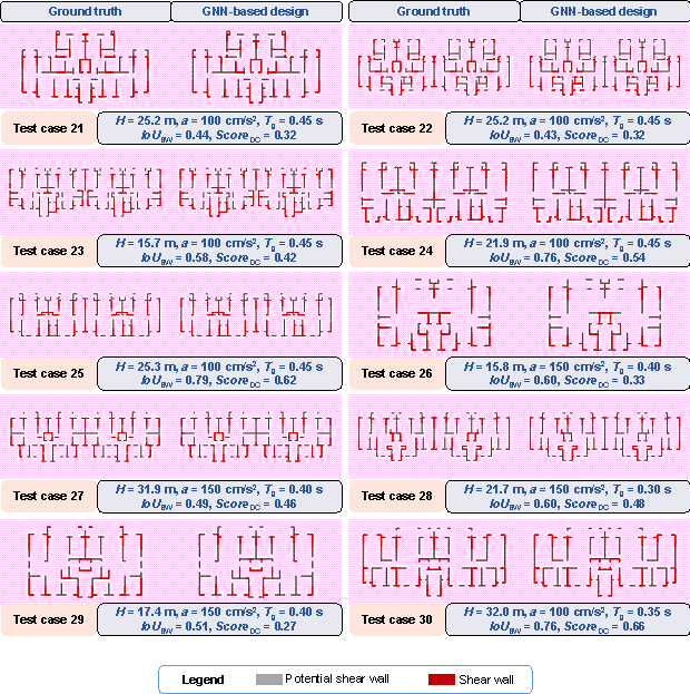 where ScoreDC is the comprehensive evaluation index; IoUSW is the IoU of the shear wall layout designed by the GNN model and that designed by engineers, which is calculated by projecting the design results on a pixel image with spatial resolution of 10 mm/pix, and the calculation method is consistent with that shown in Figure 6 in the study by Zhao et al. [3]; w1 and w2 are, respectively, the weight coefficients of the shear wall ratio in two orthogonal directions; swgt1 and swgt2 are, respectively, the shear wall ratios in the two orthogonal directions of the engineer*s design results; swpre1 and swpre2 are, respectively, the shear wall ratios in the two orthogonal directions of the GNN model*s design results; PNsw_gt1 and PNsw_gt2 are, respectively, the pixel number of the shear walls in the two orthogonal directions of the engineer*s design result; PNsw_pre1 and PNsw_pre2 are, respectively, the pixel number of the shear walls in the two orthogonal directions of the GNN model*s design result; PNwall is the pixel number of the PSW in the shear wall structure; PNSW_inter and PNSW_union are the intersection and union of the engineer-designed and GNN-designed shear wall layouts, respectively; and PNSW_gt and PNSW_GNN are the shear wall pixel numbers of the engineer-designed and GNN-designed shear wall layouts, respectively. Figure 6 Schematic diagram of ScoreDC. 4.2. Evaluation of Test Set4.2.1. Evaluation Results of Different Design Condition Combination ScenariosFigure 7 displays the average ScoreDC of the test set for the four design condition combination scenarios (GNN-DC-0, GNN-DC-1, GNN-DC-2, and GNN-DC-3) and four graph edge representation methods (Graph-PSW, Graph-PSW-DW, Graph-PSW-PW, and Graph-PSW-PW-DW). As evident from Figure 7, for all the graph edge representation methods, GNN-DC-3 exhibits the best performance, whereas GNN-DC-0 fares the poorest. GNN-DC-0, GNN-DC-1, GNN-DC-2, and GNN-DC-3 exhibit a trend of progressive performance improvements. This trend indicates that the adequacy of the design conditions positively influences the ability of the GNN-based design method to capture the performance of the shear wall layout. In addition, the Graph-PSW-DW graph edge representation method has the best overall effect, consistent with the findings by Zhao et al. [3]. Figure 7 ScoreDC for different design condition combination scenarios. 4.2.2. Comparison with Individual Training by Design Condition GroupIn Section 3.3, it is mentioned that the 30 data in the test set of this study are consistent with those used by Zhao et al. [3]. In Zhao et al. [3]*s study, the structural data with different seismic design intensities were pre-divided into three groups, namely G7H1, G7H2, and G8, and trained in separate groups. G7H1 and G7H2 indicate that the seismic design intensity is 7∼, and the PGA of the DBE is 100 cm/s2. G7H1 and G7H2 correspond to structure heights ≒ 50 m and > 50 m, respectively. G8 indicates that the seismic design intensity is 8∼, and the PGA of the DBE is 200 cm/s2. Unlike the group training approach in the study by Zhao et al. [3], this study trains all the shear wall data with different design conditions, considering the design condition as one of the data features. Figure 8 shows the difference in the average ScoreDC of the 30 test set data when comparing the proposed method with that of Zhao et al. [3]. For comparison, the design condition combination scenario GNN-DC-3 is used in this study, and GNN-Individual Training presents the training method used by Zhao et al. [3]. As shown in Figure 8, in most cases, the ScoreDC of the condition-informed design method proposed in this study is either better than or at par with the grouped training method used by Zhao et al. [3]. Zhao et al. [3] divided the data into G7H1, G7H2, and G8 groups. However, pre-grouping the data according to the design conditions often leads to a coarse grouping basis. Rough grouping limits the design conditions of the shear wall structure that the neural network can handle to the group categories, which may not align with the relatively flexible combinations of the design conditions required in practical design scenarios. Moreover, pre-grouping divides the data into several groups, reducing the amount available for individual training and thus impacting the neural network*s generalization ability. In contrast, the proposed design-condition-informed method for the shear wall layout design overcomes these limitations. Only one well-trained model is required to design the shear wall layout for any combination of design conditions. As a result, the proposed design method outperforms the pre-grouped training method in terms of convenience and flexibility when handling the various design condition combinations. Figure 8 Differences in ScoreDC between this study and Zhao et al. [3]*s study on G7H1, G7H2, and G8 design groups. 4.2.3. Difference in Shear Wall Layouts Between Two Shear Wall Representation MethodsAs depicted in Section 3.1 and Figure 3, a difference exists in the representation of the shear walls in the graph compared to that by Zhao et al. [3]. When a PSW is covered with shear walls, this study uses ※100 %§ as the proportion of shear walls at both ends of the PSW edge to represent the shear wall, while Zhao et al. [3] used ※50 %§. Figure 9a shows the ScoreDC difference between the two shear wall representation methods under the design condition combination scenario GNN-DC-3, where GNN-DC-3-100%Wall uses ※100 %§ as the shear wall proportion at both ends of the PSW edge to represent the shear wall when a PSW is covered with shear walls, and GNN-DC-3-50%Wall uses ※50 %§, which is same as the shear wall representation method by Zhao et al. [3]. It can be observed from Figure 9a that the proposed feature-representation method of shear walls exhibits a slightly better performance on ScoreDC than the feature-representation method by Zhao et al. [3]. Figure 9b shows an example f