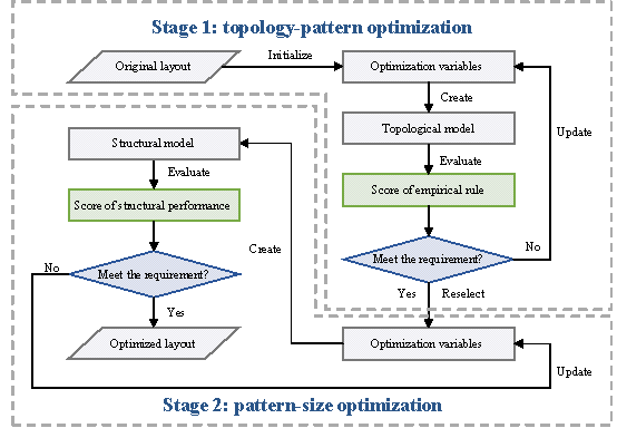 5 Optimization: two-stage optimization based on empirical rule每mechanics每material evaluation Because the shear wall structure scheme obtained using the generative approach is merely an initial proposal, the LLM controller can further adjust and optimize the scheme of the shear wall based on user requirements. In existing research on the definition of structural optimization problems, the optimization objectives commonly revolve around material consumption, such as the overall mass or volume of the structure [34,35] and total cost of construction [36每38] . Conversely, the optimization constraints primarily focus on the mechanical metrics of the structure, which encompass overall structural metrics, such as the story drift ratio, period ratio, story stiffness ratio, and rigidity每gravity ratio [34] , as well as component-specific metrics, such as the bending moment, axial force, and shear force of a component [39] . The optimization methods mentioned above are all single-stage approaches characterized by a large number of parameters. For example, a 6 by 8 grid region results in 2110 potential shear wall layouts [39] , extensive computational time (typically exceeding 10 h), and susceptibility to becoming trapped in local optima. Consequently, there is a pressing need to investigate novel optimization strategies that can effectively balance the quality and efficiency of structural optimization. 5.1 Two-stage optimization method based on topology, pattern, and size This study proposes a three-level, two-stage optimization method based on topology, pattern, and size to address the characteristics of generation outcomes, as illustrated in Figure 6. The arrangement of structural components with their connections is referred to as topology. Pattern primarily refers to the shape characteristics of a component. The size of a structural component denotes its cross-sectional dimension and length. Figure 6. Optimization of shear wall structure involves three levels: topology, pattern, and size. In this optimization method, the initial step involves utilizing the experience and requirements outlined in the structural design specifications to achieve optimization at the topology and pattern levels. This enables the preliminary determination of the structural scheme. Subsequently, adjustments to the pattern and optimization of the component sizes are performed based on precise mechanical and material quantity calculations. This further enhances the structural scheme. The quality and efficiency of the structural optimization are balanced using a two-stage optimization approach, as illustrated in Figure 7. Figure 7. Flowchart of the two-stage optimization process. To capture the topology, pattern, and size characteristics