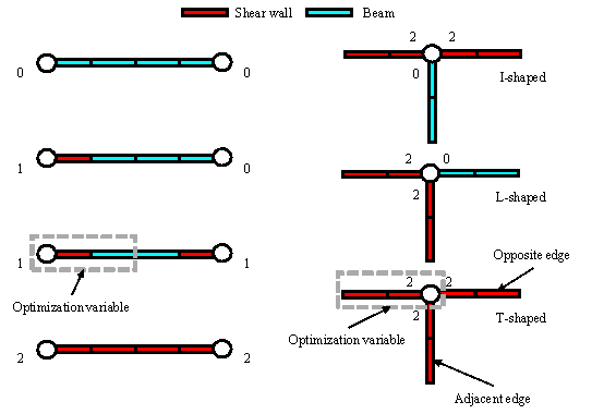 located at the center of each grid (Figure 8). For example, Figure 8. Grid-based representation method for shear wall structures. 5.2 Stage 1: ※topology + pattern§ optimization based on empirical rules To optimize the topology and pattern based on empirical rules, it is necessary to firstly define the optimization problem, identify the optimization variables, and establish the optimization objectives. (1) Optimization Variables This study introduces a universal encoding method, as illustrated in Figure 9, in which the encodings are used as optimization variables. Each node and half of its edges form a point-edge combination, with each combination having three possible encodings: 0, 1, or 2. These encodings represent different relationships. Disregarding the length of the wall, this representation method accurately captures various structural topology relationships and component patterns. Figure 9. Encoding method for node每edge combinations Furthermore, considering the global and local symmetries present in an actual structural layout, certain node每edge combinations can exhibit identical layout characteristics and can be merged. Therefore, the k-means algorithm [41] is introduced to achieve clustering. To achieve more accurate clustering, feature extraction is performed on the node每edge combinations, considering their intrinsic properties and positional relationships. These features are divided into six categories, as listed in Table 4. The features are standardized, and the clustering process of node每edge combinations is performed using the Calinski每Harbasz score [42] to select an appropriate value for K. Each class is represented by the same encoding as an optimization variable, significantly reducing the number of optimization variables and ensuring both the efficiency of optimization and the symmetry of the results. Table 4. Feature extraction of node每edge combinations