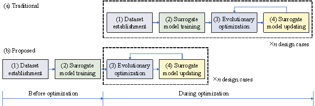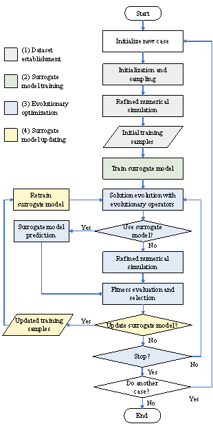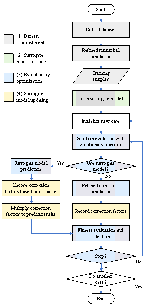 1 IntroductionExpensive optimization problems (EOPs) are prevalent in the engineering domain, characterized by high computational costs required to derive the objective functions or constraints of optimization problems, such as conducting large-scale, detailed numerical simulations (He et al., 2023) . Evolutionary algorithms (EAs), widely applied to resolve EOPs, necessitate fitness evaluations of numerous candidate solutions during the search for an optimal solution, often incurring prohibitive costs (J.-Y. Li et al., 2022) . To address this issue, surrogate-assisted evolutionary algorithms (SAEAs) have been developed recently (G. Li & Zhang, 2021; Wei et al., 2021, 2023; Xie et al., 2023) . By employing surrogate models to substitute for detailed numerical simulations during the evolutionary optimization process, the SAEAs effectively reduce the costs of optimization (Y. Jin et al., 2019; Negrin et al., 2023) . In the field of structural engineering, the optimization design of reinforced concrete (RC) shear-wall structures represents a classic EOP. Shear-wall structures, typically composed of shear walls, beams, and slabs, are extensively utilized in RC high-rise residential buildings in earthquake-prone areas. Engineers usually define several design variables based on actual situations, with each set of design variables corresponding to a candidate solution of the optimization problem and its associated fitness. During the schematic design phase of a shear-wall structure, engineers are tasked with finalizing design proposals within a matter of days. Within this period, structural engineers must complete all structural designs corresponding to multiple candidate architectural designs, and ensure that the structural designs meet physical and economic requirements through optimization, thereby placing stringent demands on the efficiency of the design optimization process. In traditional optimization design of shear-wall structures, it is necessary to establish detailed physical models of each structural member within a chosen finite element software to analyze their physical responses under various working conditions such as gravity loads and earthquakes (Y. Li et al., 2011; X. Lu et al., 2013, 2015) . This is followed by conducting a detailed reinforcement design to ascertain material usage (Men et al., 2014) . For a typical shear-wall structure, this evaluation process can take approximately 5 min for a single candidate solution. Although EAs have proven to be highly effective in the optimization design of shear-wall structures (Gan et al., 2019; Zhou et al., 2022; F. Jin et al., 2023) , they often require hundreds of fitness evaluations to reach an acceptable local optimum. Consequently, the time taken for optimization design of shear-wall structures depends completely on detailed physical models; the use of EAs is prohibitively expensive and potentially impractical in circumstances such as the schematic design phase where a quick turnaround is desirable. To address the challenges mentioned above, SAEAs have been employed to reduce the optimization costs of RC shear-wall structures and other high-rise building structures. For instance, Lou et al. (2021) developed a data-driven tabu search algorithm that employed a support vector machine to evaluate the fitness of shear-wall structures. Huang et al. (2023) introduced a surrogate-assisted genetic algorithm that used a radial basis neural network during the optimization process to evaluate the natural periods of framed-tube structures. Similarly, Alanani & Elshaer (2023) presented an artificial neural network-assisted genetic algorithm for the layout design of shear walls in high-rise buildings. Z. Wang et al. (2023) proposed an optimization method based on surrogate model updating that utilized a generalized regression neural network to substitute for wind tunnel experiments and simulations during the design process of super-tall buildings. Figure 1 Framework of traditional and proposed SAEAs The typical framework and workflow of the SAEAs mentioned above, as presented in Figures 1(a) and 2, respectively, include four main parts: (1) Dataset establishment: Initialize and sample within the design space; perform numerical simulations on the samples to acquire evaluation results, which are then used as training samples. (2) Surrogate model training: Use design variables as inputs and the evaluation results as outputs; establish a machine-learning surrogate model based on the training samples. (3) Evolutionary optimization: Perform optimization based on evolutionary operators, employing either the surrogate model or a refined method for fitness evaluation. (4) Surrogate model updating: Add the design variables and the corresponding evaluation results by refined methods to the training samples, and retrain the surrogate model.