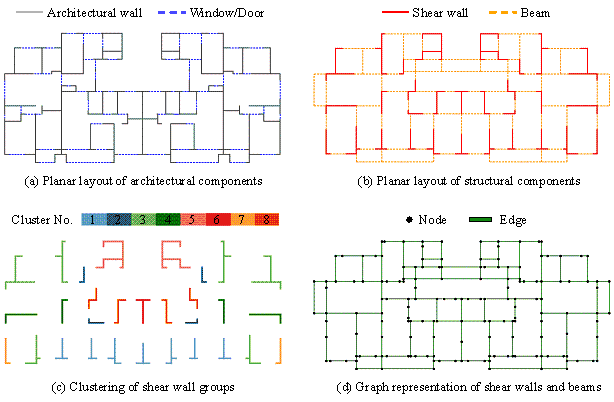 3 Optimization problem of shear-wall structural designThe design of shear-wall structures is based on architectural design, and the layout of structural components must not affect the architectural space. The structural design includes three phases, namely schematic design, detailed design, and construction drawing design, with the first phase being the focus of this study. Specifically, in the schematic design phase, an initial design is typically carried out by experienced structural engineers or trained deep-learning models (Liao et al., 2021; Zhao et al., 2022; Feng et al., 2023) . Initial design usually includes the planar layout, section dimensions, and material grades of shear walls and beams, etc. Based on the initial design, optimization design is performed to adjust the shear-wall structure so that material cost is minimized while meeting the architectural requirements of the contractors and the physical requirements of the design codes. Since the shear-wall length is a core factor affecting the physical and economic performance of shear-wall structures (Zhou et al., 2022) , this study focuses on the optimization of shear-wall lengths. 3.1 Design variablesA typical shear-wall structure is shown in Figure 6. The planar layout of architectural components in the architectural design is shown in Figure 6(a), where the shear walls can only be placed within the location of the architectural walls. The planar layout of structural components in structural design is shown in Figure 6(b), which usually includes dozens of shear walls. To reduce the number of design variables, thereby simplifying the optimization complexity, connected shear walls are defined as shear wall groups, and the K-means algorithm is used to cluster these shear wall groups (Qin et al., 2024) . The clustering is based on features such as the shape and location of the shear wall groups, as detailed in Table 2. According to Qin et al. (2024) , the number of clusters is chosen as eight. Using increased numbers of clusters, e.g., 16 and 32, has been found to have a minor impact on the optimization results. After clustering the shear walls in Figure 6(b) into eight groups, the resulting clusters are shown in Figure 6(c). Figure 6 A typical shear-wall structure Table 2 Features of shear wall groups for clustering (Qin et al., 2024)