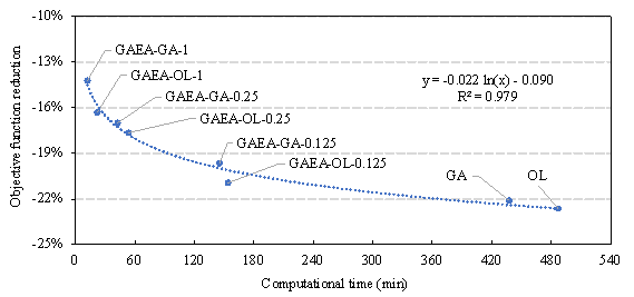 results shown in Table 7, for a 10-min optimization task, Figure 11 Objective function reduction for given identical computational time Figure 11 shows the average reduction in the total objective function after being optimized by various algorithm configurations when the same computational time is consumed. It can be observed that the optimization outcome using OL as the supporting algorithm is superior to that when using GA. This is because OL itself constructs machine-learning surrogate models, which can search the design space more effectively. Therefore, it is recommended to use OL as the supporting algorithm of GAEA, and the following sections will compare the results of GAEA-OL with GA and OL. Specifically: (1) When the available optimization time is 10 min, GAEA-OL-1 (-15.2%) > GAEA-GA-1 (-12.3%) > GA (-7.5%) >> OL (0.0%). This is because, within 10 min, GAEA can complete around 100 fitness evaluations through GNN. In contrast, GA can only perform several evaluations using FE models. OL, which needs to build a dataset, is yet to complete the training of the surrogate models within the 10-min time slot, and its optimization will not start. The total objective function reduction achieved by GAEA-OL-1 is significantly higher than the traditional methods, being 2.03 times that of GA. (2) When the available time is 45 min, GAEA-OL-0.25 (-19.8%) > GAEA-GA-0.25 (-17.0%) > GA (-14.7%) > OL (-13.8%). At this point, OL has completed the training of the surrogate models, which significantly improves the efficiency of fitness evaluation, and its optimization outcome gradually approaches that of GA. Nevertheless, GAEA still maintains a leading advantage over GA and OL. The total objective function reduction achieved by GAEA-OL-0.25 is significantly higher than the traditional methods, being 1.43 times that of OL and 1.35 times that of GA. (3) When the available time is 120 min, GAEA-OL-0.125 (-20.6%) > OL (-20.4%) > GAEA-GA-0.125 (-18.7%) > GA (-16.8%). This is because, as training samples related to this specific structure case are accumulated, the traditional case-specific surrogate model gradually approaches the generalizable GNN surrogate model in terms of evaluation accuracy. The total objective function reduction achieved by GAEA-OL-0.125 is slightly higher than the traditional SAEA, being 1.01 times that of OL. It is still significantly higher than the traditional EA, being 1.23 times that of GA. Additionally, paired sample t-tests are conducted to evaluate the statistical significance of the mean reduction in the objective function by GAEA optimization compared to those by GA or OL. The null hypothesis states that the mean reduction in the objective function by GAEA optimization is less than that by GA or OL. The p-values for comparing GAEA-OL with GA and OL are presented in Table 8, and the significance level 汐 is set as 0.1. A p-value lower than 汐 leads to the rejection of the null hypothesis, suggesting that the mean reduction in the objective function by GAEA optimization is statistically not less than that by GA or OL. When comparing GAEA-OL-0.125 with OL, the null hypothesis cannot be rejected, indicating that GAEA-OL-0.125 is not significantly superior to OL. In other circumstances, the null hypothesis is rejected, affirming that the effectiveness of GAEA is statistically significant. Table 8 P-values of the t-tests