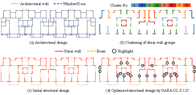 6 Case study6.1 Detailed discussion on a typical caseTo intuitively demonstrate the effectiveness of the proposed method for rapid optimization, a detailed case study is conducted on Case 5 of Section 2.3. The architectural design of Case 5 is illustrated in Figure 12(a), the clustering of the shear walls is shown in Figure 12(b), and the initial structural design is given in Figure 12(c). The design conditions are presented in Table 1. For the three optimization timing scenarios discussed in Section 2.1, the proposed GAEA (GAEA-OL-1/0.25/0.125, according to the recommendation given in Section 5.3.2), a traditional EA (GA), and a state-of-the-art ensemble learning-based SAEA (OL) are also used to perform the optimization design for Case 5. The parameter settings can be seen in Section 5.3. Figure 12 Design information and design result of Case 5 The physical responses and the material costs before and