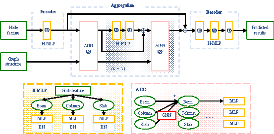 In this table, Table 6 shows that the BA representation provides the best predictive results for most components, except for slightly lower accuracy in beam height predictions. This superior performance is due to its enhanced connections between standard stories within the same building, incorporating inter-story component topological relationships. In contrast, the BB representation, which combines graphs without introducing additional edge connections, leads to poorer predictions, performing even worse than the SSO representation. Based on these experimental results, the BA structural representation method will be used in subsequent discussions. 3.2.2 Graph neural networks Figure 4 depicts the foundational architecture of HetGNN for predicting sectional sizes of RC frame structures, allowing for different GNN methodologies in the Aggregation layer. This study uses the DGL GNN framework [45] to discuss three commonly used GNNs〞GCN, GAT, and GraphSAGE. Here's a brief overview of how these methods are implemented in this context. The mathematical expression for graph convolutional network (GCN) is shown in Equation (2). Here, GAT, or graph attention layer, is defined by the mathematical expressions presented in Equations (3)每(5): where GraphSAGE employs the The number of layers Hyperparameters are optimized using the training and validation sets to select the best-fitting model, which is then evaluated against the test set for comparison. The experimental results are presented in Table 7. Table 7. Impact of different models on component size prediction