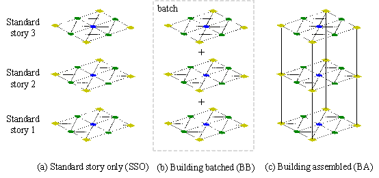 in both directions and slab thickness. A smaller For a single case that requires more detailed analysis, structural analysis models can be created using parametric modeling techniques. Metrics like story drift ratios are used for detailed analysis to ensure the structure complies with design code requirements. 3.2 Experiments on model performances 3.2.1 Structure representation methods In the current dataset, each standard story is represented by a graph. While this method effectively captures the topological relationships between components within a single standard story, it does not depict the connections between different standard stories within the building, nor does it convey the vertical topology of the components. To address this, this section introduces two additional structural representation methods that improve the connections between standard stories through graph combination and floor assembly techniques, as detailed in Table 5 and illustrated in Figure 6. Table 5. Three structural representation methods
