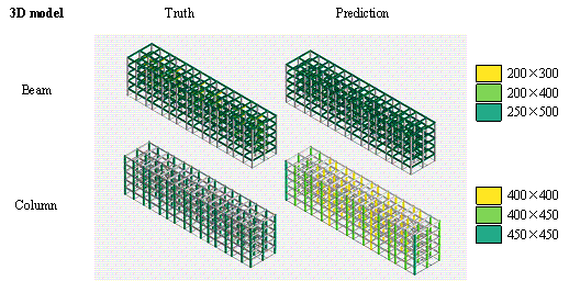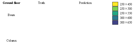 When property features, relative coordinates, height features, and seismic features are used together, the overall size prediction performance for the components is optimal. The size deviations for beam height, beam width, and slab thickness are slightly higher than the best predictions by 2.63, 0.87, and 1.70 mm, respectively. Thus, case analyses in subsequent studies will continue to use this model. The specific details of the model training process are provided in Appendix B. Additionally, an analysis of the best predictive performance under different feature inputs shows that using property features and absolute coordinates results in the most accurate predictions for beam height. When property features, absolute coordinates, and height features are combined, the predictions for beam width are the most accurate. The prediction results for column sizes are heavily influenced by the choice of features, with relative coordinates generally performing better than absolute coordinates. The best results for column size predictions occur when property features, relative coordinates, height features, and seismic features are used together. Conversely, slab thickness is more influenced by its intrinsic property features, and adding extra information can reduce prediction accuracy. 3.3 Case studies Using real-world engineering cases from the test set, preprocessing is carried out according to the method described in Section 2.3. Component sizes are then predicted using the HetGNN model. Next, column section sizes are adjusted based on design experience, as outlined in Section 2.5. This is followed by the assembly of floors and mechanical calculations using YJK-GAMA as shown in Figure 7. The AI-designed sectional sizes are compared with the actual sizes, and the story drift ratios of the AI-designed structures are compared to those of the ground truth to verify the safety of the design method. Visualization results for some specific cases are presented in Figure 8, with each case's design process completed in under one second. Figure 7. Parametric modeling and calculating using YJK-GAMA.