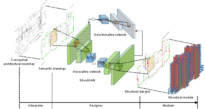 Abstract: Artificial intelligence is reshaping building design processes to be smarter and automated. Considering the increasingly wide application of shear wall systems in high-rise buildings and envisioning the massive benefit of automated structural design, this paper proposes a generative adversarial network (GAN)-based shear wall design method, which learns from existing shear wall design documents and then performs structural design intelligently and swiftly. To this end, structural design datasets were prepared via abstraction, semanticization, classification, and parameterization in terms of building height and seismic design category. The GAN model improved its shear wall design proficiency through adversarial training supported by data and hyper-parametric analytics. The performance of the trained GAN model was appraised against the metrics based on the confusion matrix and the intersection-over-union approach. Finally, case studies were conducted to evaluate the applicability, effectiveness, and appropriateness of the innovative GAN-based structural design method, indicating significant speed-up and comparable quality. Keyword: intelligent structural design, shear wall system, generative adversarial network, computer vision, data and hyper-parametric analytics 1 INTRODUCTIONIntelligent design offers advantages in its ability to minimize manual design work, promote diversity in the design space, and ultimately provide optimal design performance [1-5]. As a result of rapid global urbanization, the demand for high-rise residential buildings is continuously increasing [6,7]. Reinforced concrete shear wall systems have been widely used in high-rise designs. The transfer of architectural proposals to construction documents involves arranging structural layouts, defining the position and orientation of structural systems, and controlling the dimensions of structural components [8]. These steps are fundamental to the design process. However, because of their iterative nature, they are also very time consuming, even when conducted by competent engineers. An innovative design approach with greater efficiency is needed, and the intelligent structural design is an emerging approach. Existing approaches are primarily based on generative design. The commonly used options are as follows: (1) design exploration using topology optimization, genetic algorithms, and cellular automata; (2) design synthesis using generative grammars; and (3) design by analogy [1-5]. These approaches are particularly favorable for geometric modeling and are less suitable for engineering calculations. Hence, they are mainly applied to architecture and have found very few applications in structural design. In addition, the considerable computational expense of the underlying algorithms forfeits their use in the scheme design stage. Deep learning methods offer a new option to overcome these challenges. They have been used efficiently for various purposes via pre-training [9-12]. The generative adversarial network (GAN) is one of the most widely used frameworks [13] for automated architectural design [14-16]. In a GAN framework, the generative network learns to generate candidates of interest, while the discriminative network distinguishes the generated candidates from the ground truth [13]. The generator synthesizes images using the initial input noises and enhances the generation quality based on the feedback from the discriminator until the discriminator fails to judge. Simultaneously, the discriminator consistently elevates the skill at detecting synthetic outputs by the generator. Finally, GAN converges to a Nash equilibrium between the discriminator and generator. Adversarial training is applied to both networks so that the generator and discriminator can master the generation and discrimination, respectively [13,17,18]. Additionally, compared with the convolutional neural network (CNN)-generated images, GAN-synthesized images are more refined and precise [17,18]. GAN has been successfully adopted in innovative architectural home design [14-16], and barely used in structural design. Hence, this study extends the application of GAN to shear wall structural design. The GAN model improves the design proficiency by learning from existing design documents, thus offering a significant improvement in design efficiency and performance. This paper presents the development and optimization of a GAN-based structural design framework, StructGAN, in Section 2. Then Section 3 elaborates the implementation of StructGAN, including dataset establishment, the associated engineer-perception-based and computer-vision-based performance metrics, and design process. Next, Section 4 introduces detailed discussions on GAN networks and datasets. Moreover, in Section 5, by comparing designs by StructGAN and competent engineers, case studies of the GAN-based framework suggest that it is a promising and versatile design approach for the future. Finally, Section 6 presents the conclusions of the study. 2 STRUCTGAN METHODStructGAN was developed to address the growing concerns in the construction industry. Some of the negative impacts experienced include (1) the lack of an efficient communication link between architects and engineers, (2) the low cost-effectiveness in the design iterations, and (3) the quality uncertainties associated with experiential knowledge [19,20]. Therefore, process optimization and automation are necessary to minimize the total project time and cost. As such, StructGAN attempts to achieve the highest efficiency via artificial intelligence. It resolves the highly involving correlation between the architectural and structural fields through sophisticated maps established by deep learning, which converts the iterations to one-step solutions, reduces variations in design quality, and strengthens the control of design processes. The strategic innovations adopted by StructGAN involve a semantic engagement of prior knowledge a