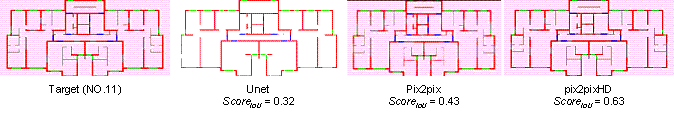 where ¦ÇSWratio = 1 − |SWratioGAN − SWratiotarget| / SWratioGAN. SWratioGAN, and SWratiotarget are the shear wall ratios of the GAN designs and target designs, respectively. ¦ÇSIoU and ¦ÇWIoU are the weighted coefficients of SIoU and WIoU, respectively, both equal to 0.5. For the evaluation of the StructGAN-designed shear wall layouts, WIoU, which reflects the generation quality of the overall walls in images, and SIoU, which reflects the quality of the auto-designed structural shear wall layouts, are equally important. Thus, the weights ¦ÇSIoU and ¦ÇWIoU are set to 0.5. Moreover, the ¦ÇSWratio denotes the correction coefficient for the overall quantity of shear walls. The values of WIoU and SIoU increase with the increment in shear walls, which is unfavorable for the evaluation. Hence, the difference in the total shear wall area between the synthetic image and target image is adopted as the correction coefficient, and a smaller diversity corresponds to a larger ¦ÇSWratio. 3.3 StructGAN designStructGAN is primarily developed for the preliminary schematic design, and partly for structural design development, following the guide in Figure 2. Before StructGAN-based structural design starts, the architectural drawing, seismic design intensity, and structural height should be obtained. The structural design result can be obtained by inputting the semantic architectural drawing into StructGAN. Presently, due to the end-to-end deep learning feature, StructGAN has not yet provided interaction with users, which is different from the conventional generative design tools proposed by Shea et al. [41]. Furthermore, the detailed process of converting the structural plan design into an overall structural analysis model is as follows: Quantitative evaluation of the design images based on ScoreIoU: The structural plan design is first obtained by StructGAN and evaluated by comparison with designs by engineers. Establishment of the corresponding structural analysis models based on the StructGAN designs: The detailed process of converting the bitmap of the shear wall design into a structural analysis model is shown in Appendix A. Based on the structural design model, PKPM can automatically conduct steel reinforcement design according to Chinese design codes [42]. Additionally, related studies on optimization design methods for steel reinforcement [43] can also be integrated into StructGAN in the future to improve StructGAN design capability. Performance analysis of structures: This study used the PKPM software to conduct overall structural design and time-history analyses [42], and then yielded the direct economic loss under the maximum considered earthquake using the FEMA P58 method [23]. Note that, it is also easy and friendly to add new data for training, by adopting the pre-processing method for semantic architectural and structural CAD drawings to create new training data (approximately cost 5-10 min) and then adding them into datasets and training. For further application, corresponding GUI and datasets will be developed. The StructGAN application results will be elaborated in Section 5 (StructGAN Performance), including 16 structural plan designs and two overall structural designs for shear wall residential buildings. This study ensured no data crossover between the training sets and 16 testing cases for testing reliability. To further evaluate the generalization performance of StructGAN, two overall structural design cases supplied by an architectural design firm were used. These designs were excluded from the training and test sets. Furthermore, these application results will show the StructGAN with a powerful generalization ability for different design conditions. 4 DISCUSSIONS OF NETWORKS AND DATASETSBased on the proposed StructGAN and its implementation methods, detailed discussions and analyses on the StructGAN were conducted to obtain a high-performance system, whose most critical parts are the GAN algorithm and dataset. Hence, the Discussion section presents the analysis for the selection of GAN algorithm and the corresponding parametric adjustment along with the pre-processing of the datasets, based on the developed performance evaluation methods and metrics. 4.1 GAN algorithm and parametric adjustmentThe pix2pix [17] and pix2pixHD [18] algorithms are typical high-performance GAN algorithms. Compared with pix2pix, pix2pixHD is an improved algorithm that can generate high-resolution photo-realistic images with significantly higher computational demands [18]. In the above two algorithms, the characteristic ¡°structures loss¡± can effectively reflect the physical position relationship of pixels in an image [17]. Thus, deduced from the ¡°structures loss,¡± pix2pix and pix2pixHD can capture the potential spatial position distribution of structural layouts. The structural distribution correlation can contribute to establishing a direct map relationship for StructGAN to convert the crucial architectural elements into the corresponding structural layouts. Furthermore, their significant performance in generative architectural design has proved the applicability of pix2pix and pix2pixHD [14,15]. This study compared pix2pix and pix2pixHD with one of the most famous CNN-based image synthesis methods (i.e., UNet), to validate the advantage of pix2pix and pix2pixHD in generative structural design. See the study of Ronneberger et al. [44] for more details of UNet. UNet, pix2pix, and pix2pixHD are all trained to the best state using the same training datasets, and the design results are shown in Figure 6. From the perspectives of objective scoring and subjective judgment, pix2pix and pix2pixHD both perform better than UNet. Moreover, as the UNet design demonstrates, all positions are assigned with shear wall components, which means UNet has not learned the principle of where to assign shear wall and how many shear walls to set. The primary reason is that UNet lacks an adversarial t