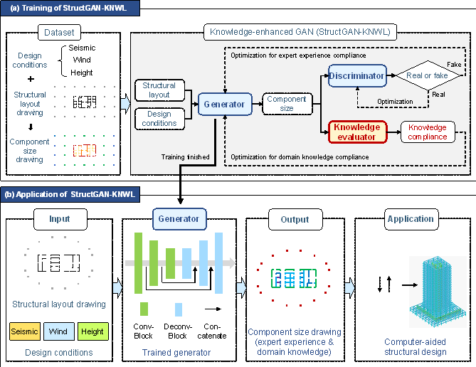 AbstractIn the schematic design phase of framed tube structures, component sizing is a vital task that requires expert experience and domain knowledge. Deep learning-based structural design methods enable machines to acquire expert experiences, but domain knowledge (e.g., empirical laws summarized by engineers from engineering practices) has not been embedded into such data-driven methods, resulting in common sense-conflicting designs. A knowledge-enhanced generative adversarial network is proposed by incorporating a novel differentiable evaluator for compliance checking of domain knowledge. A comparative study indicates that the proposed knowledge-enhanced method is 51% superior to the conventional data-driven method and 150 times faster than a competent engineer. The proposed method facilitates the schematic design of framed tube structures to be automatic and efficient, hence improving the productivity of structural engineers. This study might inspire the development of other knowledge-enhanced deep learning methods and their application in civil engineering. KeywordGenerative adversarial network; domain knowledge; expert experience; intelligent structural design; framed tube structure 1. IntroductionWith rapid urbanization worldwide, framed tube structures have increasingly popular applications in high-rise buildings. The design process of framed tube structures can be generally divided into three phases, namely the schematic design phase, detailed design phase, and construction drawing design phase. As indicated in Figure 1, the impact of decisions is quite significant during the schematic design phase because the subsequent designs are all reliant on the schematic design (Wang et al., 2002). However, the tools in that phase are scarce, because the imprecise and incomplete understanding of design requirements and constraints makes it challenging to use computer-based tools in this early phase (Hsu & Liu, 2000). Therefore, this study focuses on the schematic design phase where the greatest opportunity exists. Owing to the complexity of the structural system and lack of tools, the schematic design of framed tube structures is a difficult task that relies on expert experience and domain knowledge. Traditionally, senior engineers with adequate design experience and knowledge are responsible for manually developing schematic designs based on the layout, height, seismic risks, and wind loads, laying a foundation for subsequent design phases. The section sizes of structural components, particularly vertical components, are crucial to the schematic design. If the schematic design significantly deviates from the detailed one, the computational, labor, and time costs associated with structural optimization and adjustment will significantly increase. Ideal component section designs could be impractical in some of these circumstances. Currently, the schematic design of the component section size relies exclusively on engineers¡¯ personal experience and knowledge. It is challenging to improve working efficiency beyond human limits and pass on these experiences and knowledge to junior engineers. Therefore, an intelligent design method for component section size is desired in the schematic design phase (Figure 1), which should be capable of accumulating expert experience and mastering domain knowledge, allowing this design phase to be automatic and efficient. Figure 1 Design process of framed tube structures (modified from Wang et al. (2002))In recent years, the emerging deep learning has been providing new solutions to structural design, particularly schematic designs that rely on human experience (M¨¢laga-Chuquitaype, 2022). In terms of the schematic design of building structures, deep learning-related methods are mainly based on computer vision techniques that represent structural designs as images (Ampanavos et al., 2021; Liao et al., 2021 & 2022; Pizarro et al., 2021; Lu et al., 2022). Structural design methods based on generative adversarial networks (GANs) have made significant breakthroughs. A GAN is an advanced deep learning framework that comprises two neural networks known as a generator and a discriminator (Goodfellow et al., 2014). GANs can learn complex real-world probability distributions in a game between the generator and discriminator. After reaching Nash equilibrium, GAN can generate realistic image outputs by sampling from learned probability distributions (Newton, 2019; Qian et al., 2021; Rahbar et al., 2022). Specifically, Pizarro et al. (2021) proposed a conceptual design method for shear wall structures, combining a regression model and GAN, Liao et al. (2021 & 2022) and Lu et al. (2022) proposed GAN-based structural wall layout methods, Zhao et al. (2022) proposed a GAN-based design method for beams and slabs, and Fei et al. (2022) proposed a GAN-based shear wall structure design system. Some researchers have also proposed structural design methods based on other deep learning techniques. For example, Chang & Cheng (2020) proposed a structural optimization method based on graph neural networks, the scope of which was limited to frame structures. These studies trained deep learning models on large-scale datasets of existing structural designs, successfully accumulating expert experience to a certain extent and providing powerful tools for schematic design. However, existing methods rarely consider domain knowledge, which is crucial for both structural design and deep learning. The absence of domain knowledge results in problems, including conflicts between generated designs and the common sense of engineers and difficulty in further improving the model performance. Domain knowledge in structural design is the empirical laws summarized by engineers from engineering practices. Also known as the structural concept, it is a comprehensive reflection on aesthetics, mechanics, constructability, cost, etc. (Lin, 1988). For example, when designing the layout of shear walls, engi