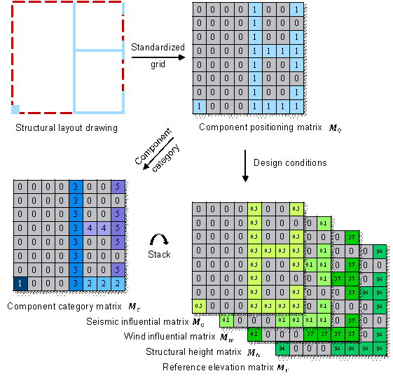 component category matrix To facilitate the embedding of domain knowledge (see Subsection 4.2 for details), when representing design drawings as matrices, it is necessary to ensure that: 1) the symmetry axis of the structural layout coincides with that of the matrix; 2) collinear shear walls can be in the same row of the matrix after a certain angle of rotation; and 3) vertical components are in the same position in the matrices of all standard stories.