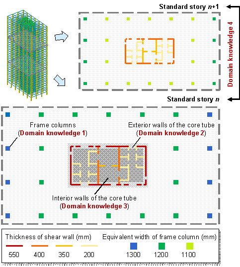 Based on the above design feature representation and fusion method, the input tensor-label tensor pairs can be obtained for supervised training of GANs. In this way, the GAN can accumulate expert experience and generate component size designs accordingly. 4. Domain knowledge embedding4.1 Domain knowledge in component section designIn the schematic design of the component section size, considering only expert experience is insufficient, and appropriate domain knowledge must be embedded. After literature review and consultation with experienced engineers, this study summarizes the domain knowledge required in the schematic design of the component section size (introduced in Subsection 2.1) by considering the following two types of relationships: 1) planar relationship, i.e., the relationship between the section sizes of different components on the same standard story; 2) Vertical relationship, i.e., the relationship between the section sizes of the vertical components on different standard stories. The corresponding loss functions are formulated as follows: Figure 7 Domain knowledge in the component section design of framed tube structures1) Planar relationship: for the vertical components of the framed tube structures, the planar relationships include the following specific domain knowledge (Figure 7): Domain knowledge 1: Symmetrically positioned frame columns should share the same section size owing to aesthetics and mechanics requirements (Stromberg et al., 2011; Song et al., 2016; Lou et al., 2021). On the one hand, symmetry has always been a predominant design element in architecture (Hargittai & Hargittai, 2015). On the other hand, asymmetry of structural components results in a deviation between the center of rigidity and the center of mass, possibly causing undesirable torsion under horizontal actions. The corresponding loss function can be defined using Equation (11):