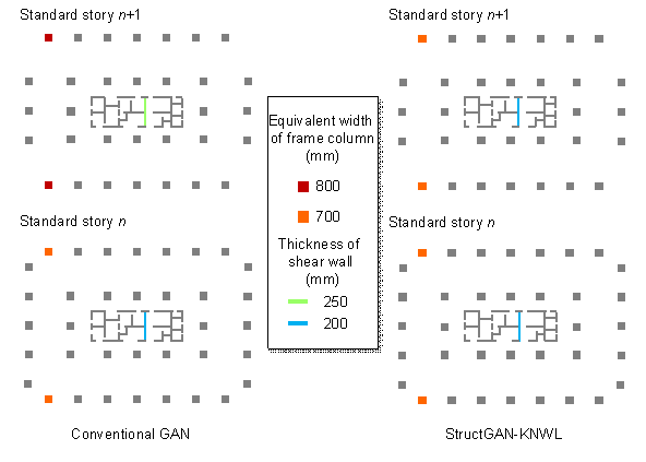Scheme 3: For frame columns, exterior walls, and interior walls, embed corresponding domain knowledge, respectively, and train three StructGAN-KNWL models. For each category of structural component, both a planar relationship and a vertical relationship are considered, as shown in Figure 9(c). In the application stage, three categories of structural components are respectively generated by the corresponding GAN and then integrated into a complete design.