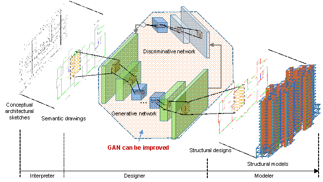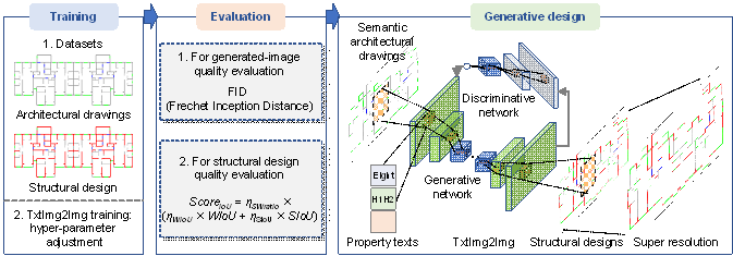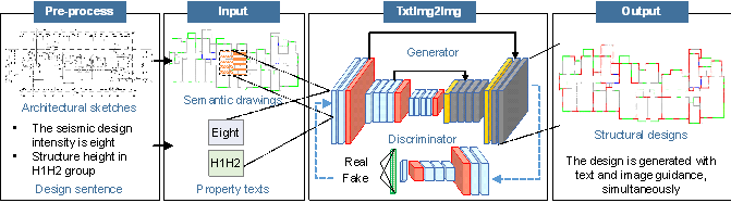 Intelligent Generative Structural Design Method for Shear-wall Building Based on ※Fused-Text-Image-to-Image§ Generative Adversarial NetworksWenjie Liao a, Yuli Huang a, Zhe Zheng a, Xinzheng Lu a,* a. Department of Civil Engineering, Tsinghua University, Beijing, 100084, China Corresponding author: Xinzheng Lu (luxz@tsinghua.edu.cn; +86-01062795364) Co-authors: Wenjie Liao (liaowj17@mails.tsinghua.edu.cn); Yuli Huang (yulihuang@gmail.com); Zhe Zheng (zhengz19@mails.tsinghua.edu.cn) AbstractLike the way engineers designing buildings, competent generative design methods try to understand the prescriptive requirement in text and architectural sketches, apply engineering principles and develop the structural design. However, this requirement may be challenging to existing methods because they are not good at simultaneously taking text and image input and then generating designs. This study proposed an innovative design approach, TxtImg2Img, to overcome the difficulties. Based on generative adversarial networks architecture, the generator is proposed to encode, extract and fuse texts and images, and generate new design images; the discriminator is developed to judge real and fake images and texts. Consequently, TxtImg2Img is advantageous in extracting features from the multimodal text and image data, fusing the features using the Hadamard product, and generating designs to satisfy the text-image requirements after learning from a limited number of design samples. Specifically, TxtImg2Img can generate structural design images without distortion, and the corresponding structural design meets the mechanical requirements, after being trained by dozens of words and hundreds of image data. The case studies confirm performance improvement of up to 21% and that the proposed approach presents a promising breakthrough for intelligent construction. Keywords |