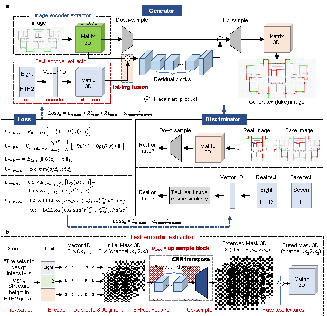 language text into a text mask with high-dimensional features ( Figure 3. TxtImg2Img networks. a. generator and discriminator of TxtImg2Img: the generator includes image and text encoding, feature extraction, and feature fusion networks; a discriminator was adopted to distinguish real and fake image pairs. b. text每encoder每extractor network: the text is encoded as a vector, the vector is converted into a matrix by duplication, augment, and feature extraction; different matrixes are fused using Hadamard product and output.In addition to the image generator, the discriminator and the text loss of generator and discriminator are developed in this study based on Li et al. (2019a & 2020). The discriminator is demonstrated in Figure 3a, where real or fake texts distinguish networks are added. As Equation (5) shows, text loss for the generator is the cosine similarity of real and fake text vectors, outputted by the text-encoder-extractor module. With the difference of real and fake vectors increasing, the text loss of the generator decreases, indicating the real and fake text features can be accurately extracted, respectively. Moreover, Equation (6) shows that the text loss for the discriminator is calculated by the cosine similarity between the feature vectors of text and image. Specifically, real text and real image features should be closer (the corresponding cosine similarity is close to 1), making the binary cross-entropy loss of cosine similarity and true label (= 1) small. On the other hand, the cosine similarity of fake text and real image features should be closer to 0, making the binary cross-entropy loss of cosine similarity and false label (= 0) small. Additionally, more details on LGAN, LFM, and LVGG are discussed in the pix2pixHD study of Wang et al. (2018). Based on the image and text loss of generator and discriminator, the objective function can be calculated as Equations (7) and (8). The optimization of generative adversarial networks is to minimize the total loss of generator and discriminator.