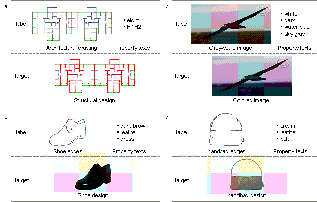 3. TxtImg2Img Implementation Figure 4. TxtImg2Img application steps: training, evaluation, and generative design.The TxtImg2Img method can be adopted not only for designing structures of shear walls but also for the appearance of shoes and handbags. It is composed of three main steps (Figure 4): 1) establishment of training and test datasets and training of TxtImg2Img, 2) testing and evaluation of TxtImg2Img, and 3) generative design using the well-trained TxtImg2Img. 3.1 Datasets and TxtImg2Img trainingEstablishing datasets for TxtImg2Img training and testing is the basic step in the application process. This method is primarily used for structural design. In addition, this study also tested the universal applicability of TxtImg2Img in other engineering and industrial designs. Note that no building-related open-access datasets are available for generative design, so designing appearances of shoes and handbags, and coloring of gray images are selected as the supplementary datasets. Four datasets were established, namely, architectural-to-structural design (original image data from Liao et al. (2021)), shoe edges-to-appearance design (original image data from Isola et al. (2017)), handbag edges-to-appearance design (original image data from Isola et al. (2017)), gray-to-colored bird image conversion (original image data from Wah et al. (2011)). Based on the raw image data (without the corresponding text property), this study created suitable text descriptions for all labeled images. The labeled images were used to generate target images with the corresponding text properties. Typical data for the four different types of datasets are shown in Figure 5. Figure 5. Typical images and the corresponding text properties (image size = 512 ℅ 256). a. architectural-to-structural design datasets (224 training and 24 test data). b. gray-to-colored bird image conversion datasets (588 training and 141 test data). c. shoe edges-to-appearance design datasets (600 training and 150 test data). d. handbag edges-to-appearance design datasets (600 training and 150 test data).Figure 5a shows a typical architectural-to-structural design dataset, with 224 training data and 24 test data. In the study of Liao et al. (2021), all raw data (i.e., architectural drawings and the structural design drawings of ground truth) were collected from more than ten famous architectural design and research institutes in China, to ensure the quality of the source design. Moreover, these designs satisfied all relevant design specifications, were optimized and evaluated by experienced engineers, and were adopted in real-world construction applications with excellent quality. Based on the raw drawings, the semantic process was adopted to extract critical elements of raw drawings and enhance training performance, where semanticization is to extract essential architectural and structural elements in design images and code them by color patterns. The images in Figure 5a are typical semantic drawings, and more detailed datasets can be found in the study of Liao et al. (2021). The seismic design intensity and structural height determine the structural design requirements of a shear wall building (Qian et al., 2018). Liao et al. (2021) further grouped the training and test datasets according to the aforementioned two critical factors. Moreover, the classification metrics of the factors were derived from the Chinese Code for Seismic Design of Buildings (GB50011-2010, 2010). Consequently, three groups of datasets were established: Group7-H1 (63 training data, 8 test data), Group7-H2 (80 training data, 8 test data), and Group8-H1H2 (81 training data, 8 test data). Here, Group7 and Group8 denote seismic design intensities of 7-degree and 8-degree, respectively. The corresponding peak ground accelerations (PGAs) of the design-based earthquake (DBE, the exceedance probability in 50 years of the DBE is 10%) are 100 cm/s2 and 200 cm/s2 in the 7-degree and 8-degree seismic intensity zones, respectively. H1, H2, and H1H2 denote structural heights of < 50 m, 50每150 m, and 0每150 m, respectively. In the 8-degree seismic intensity zones, the high seismic design intensity dominates the demands for structural seismic resistance, whereas the structural heights slightly influence those demands; thus, the designs in the 8-degree seismic intensity zones were not grouped by structural heights. Based on the image datasets of Liao et al. (2021), this study merged different grouped datasets and added text properties of images according to the original group names. As shown in Figure 5a, the text property ※eight§ denotes that the seismic design intensity is 8-degree; ※H1H2§ denotes the structural height attribute. The text properties of the other datasets were similar to those of the architectural-to-structural design datasets shown in Figure 5a. The gray-to-colored bird image conversion datasets included four text properties, as shown in Figure 5b: bird head color (white), body color (dark), 1st background color (water blue), and 2nd background color (sky gray). The shoe edges-to-appearance design datasets included three text properties, as shown in Figure 5c: shoe color (dark brown), material (leather), and style (dress). The handbag edges-to-appearance design datasets included three text properties, as shown in Figure 5d: handbag color (cream), material (leather), and belt or none (belt). Using the datasets, the training and testing of TxtImg2Img and the critical hyperparametric analysis were carried out. More detailed training and analysis of TxtImg2Img are presented in Section 4. 3.2 Evaluation and metricsStudies on rational generation evaluation methods are critical and challenging for GANs. At present, Fr谷chet inception distance (FID) is a highly accepted evaluation method that is applicable to most image generation quality evaluations (Heusel et al., 2017). In the FID-based evaluation method shown in Figure 6a, a high-dimensional image featur
