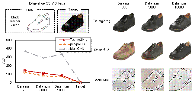 As shown in Tabel 3 and Figure 11, the structural dynamic characteristics are highly related to the layouts of shear wall components. Specifically, the seismic deformation response of the Case-7d50m structure can effectively meet the design code requirement. Although the design is a little conservative, the number and length of structural components have almost reached the lower limit of the design. Once the components become less, the strength of the structure can hardly satisfy the code requirement. Compared with Case-7d50m, the number of shear wall components increased slightly due to the higher structure height. The overall structural stiffness is relatively small, and the corresponding inter-story drift ratio is greater but still within the deformation limits of the design code. As for Case-8d100m, its seismic design intensity is highest, and the corresponding seismic action is quite large, so the layout and number of shear wall components are obviously increased to resist more intensive seismic action, ensuring the structural deformation can effectively meet the code requirements. Figure 12 Structural deformation response under seismic action. (a) Case-7d50m, (b) Case-7d100m, (c) Case-8d100m.Consequently, the analysis results indicate that both the structural design image and the corresponding established overall structural analysis model can effectively reflect the guiding effect of the design condition texts on the structural design, and the mechanical performance of the designed structure can effectively meet the corresponding code. 5.3 Designs for shoes, handbags, and colored birdsSection 3.1 discusses the creation of the datasets and the corresponding text properties. Based on these datasets, TxtImg2Img was also trained, tested, and evaluated. Unlike structural design, the three types of datasets had no specific evaluation methods or metrics. Hence, this study used the widely used FID indicator for evaluation (Heusel et al., 2017). Figure 13 shows a comparison of the FID-based evaluation results and typical generated images. The datasets for shoe edges-to-appearance and handbag edges-to-appearance designs were adopted for training and testing. The corresponding evaluation results of the TxtImg2Img, pix2pixHD, and ManiGAN designs are shown in Figures 13a and 13b, respectively. Specifically, ManiGAN had the worst performance. pix2pixHD did not generate oriented images without text guidance; hence, the color of the pix2pixHD-designed shoe was brown, which was different from the target color of black. In contrast, TxtImg2Img effectively generated a shoe appearance with the text property guidance. Moreover, the FIDs of TxtImg2Img and pix2pixHD were relatively similar, indicating that the texture and authenticity of the TxtImg2Img-generated images were approximately similar to those generated using pix2pixHD. Figure 13. Comparison of performance evaluation and typical generations. a. shoe edges-to-appearance design datasets; b. handbag edges-to-appearance design datasets; and c. gray-to-colored bird image conversion datasets.Figure 13c shows the generation performance of the different methods using the gray-to-colored bird image conversion datasets. The figure shows that the image generated by TxtImg2Img was not good, as cases with sophisticated features and properties require attention mechanisms, as indicated by Li et al. (2020). However, the training of neural networks with attention mechanisms requires an enormous amount of data (at least hundreds of thousands of images and corresponding sentences). As such amount of data were not available in this study, the attention mechanism was not adopted. Figure 14. TxtImg2Img-generated images with different text properties. a. Architectural-to-structural design datasets; b. shoe edges-to-appearance design datasets; and c. handbag edges-to-appearance datasets.Subsequently, Figures 14a and 14b show the designed appearances of the shoes and handbags, respectively, with different properties. With the same edge inputs and different text properties, the TxtImg2Img designs basically conformed to the text descriptions. In addition, one critical advantage of the TxtImg2Img method proposed in this study is its relatively excellent generation ability under few-shot learning. The cases mentioned earlier proved that TxtImg2Img performed well under small training datasets (less than 1000 data). In addition, this study also augmented the Edge2shoes datasets from the initial 600 to 10,000 of training data (dataset size increased by approximately 20 times). The impact of dataset size on the method was investigated by comparing the performance of trained TxtImg2Img using different sizes of datasets. As shown in Figure 15, the test performance of TxtImg2Img trained using 600 of data only was almost equivalent to that trained using 10,000 of data. The difference of their FID was relatively small (FID600 / FID10000 = 1.69), and the perceptual evaluation could hardly distinguish the difference between them. Therefore, TxtImg2Img has an excellent image generation ability under small training datasets (less than 1000 datasets). Figure 15. Generative design performance affected by different training dataset sizes.6. ConclusionsIn this study, we developed a novel GAN-based structural design method, namely TxtImg2Img. TxtImg2Img can generate structural designs according to the guidance of text properties and primary images by simultaneously inputting an architectural drawing and the corresponding text properties. The method effectively breaks through the limitation that existing generative design can only learn and generate based on image, with few-shot learning. Compared with StructGAN, TxtImg2Img improved the shear wall structural design performance by up to 21%, thereby facilitating GAN-based structural designs. The detailed conclusions are as follows. (1) Based on the GAN architecture, text encoding, text feature extraction, and text-image feature fusion neura