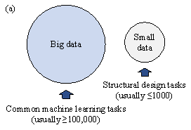 1. IntroductionIntelligent structural design is one of the key capabilities that can transform traditional construction industry practices into autonomous smart systems in the era of Construction 4.0 [1-3]. In recent years, machine learning (ML)-based intelligent structural design has progressed rapidly into a state that is potentially viable for practical applications [4]. In this paradigm, smart systems developers are not required to define or utilize specific design rules, as entailed by the traditional structural optimization methods. Instead, only the architecture of the ML algorithm needs to be defined and training data be provided for the algorithm to learn. The axiom is that the ML algorithm can automatically and implicitly discover effective design rules from the given input data [4]. However, since the design rules themselves are derived from data, the effectiveness of the current ML methods is therefore heavily dependent on the quality and quantity of the training data. The underlying data issues have become an important factor restricting the applications of the ML methods in practical structural design [5-6]. The present study attempts to solve two major problems inherent in intelligent structural design applications - namely, (1) data are typically available in insufficient amounts (Figure 1(a)) and (2) data are imbalanced with long-tailed distributions (Figure 1(b)). These issues are elaborated in what follows.