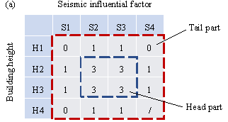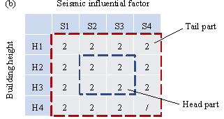 Module 2: First generation of proxy labels The first-generation proxy labels are used to form a balanced dataset, and therefore, should correspond to tail design‑condition combinations. For a given tail design‑condition combination, the seismic influential factor and the building height of the proxy label are randomly selected within its design‑condition class. Then, the architectural designs of the proxy labels are shared with the adjacent design‑condition combinations. A typical case is illustrated in Figure 10(a). Finally, 25 sets of inputs (i.e., architectural design and design conditions) are constructed, and the corresponding proxy labels are generated using Model-SL. Since Model-SL is biased, the above proxy labels are biased towards their original design conditions and cannot fully satisfy the new design conditions. Note that if additional architectural designs are available, they can be used directly without adopting the sharing strategy shown in Figure 10(a). Otherwise, when choosing adjacent design condition combinations, it is preferable that the optimization tendency can be determined so that the variable bounds can be narrowed to accelerate convergence, as specified in Section 3.3, Step ¢Û. When generating proxy labels, the combination of S4 and H4 is not considered, as it is not possible for them to coexist [10]. Figure 10. Distribution of proxy-labeled data. (a) Sharing of architectural designs; (b) Small, balanced dataset; (c) Large, balanced dataset (in parentheses are the numbers of proxy-labeled data)Module 3: Optimization of proxy labels The generated proxy labels are optimized using the proposed structural optimization procedure. For the genetic algorithm, an iteration number of 20 and a population size of 10 are used so that the time consumption is acceptable. Notably, the proposed structural optimization procedure can obtain satisfactory results with a smaller iteration number and population size than the conventional method by incorporating a two-stage evaluation strategy and empirical design rules. Other parameters are set as follows: the crossover probability is 0.9, the distribution index is 20 for both crossover and mutation operators, and the mutation probability is the inverse of the number of variables [44]. Depending on the complexity of the shear‑wall structures, the time consumption for each design varies from 1 h to 12 h. The optimization results are listed in Table 3, which are in line with expectations: the total length of the shear walls decreases in cases where the design conditions are either relaxed or unchanged, or increases in cases where the design conditions are either tightened or unchanged. For the cases where one design condition is relaxed and the other tightened, the change in the total shear‑wall length is minor. Note that the ¡°Undetermined¡± class in optimization tendency should be minimized. Table 3 also lists the number of variables before and after adopting the reduction strategy proposed in Section 3.3, Step ¢Û. On average, the number of variables is reduced by 81% after considering three ways to decrease the possible combinations of variables. Table 3. Optimization results and variable numbers of proxy labels