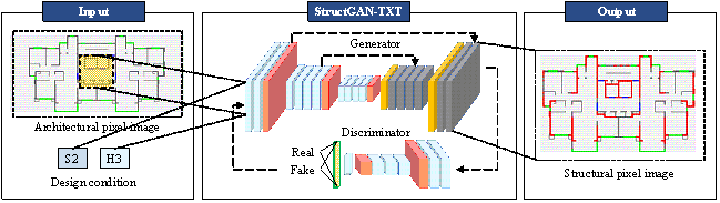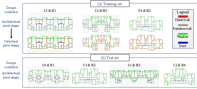 Figure 3. Distribution of data points on design conditions. (a) Long-tailed training set; (b) Balanced test set.Considering the seismic influential factor and building height, a small, long-tailed training set (20 data points) and a balanced test set (30 data points) are constructed. The small, long-tailed training set has more data points (3 data points) on the four design condition combinations of S2 or S3 with H2 or H3, and few data points (0¨C1 data points) on other design condition combinations, thereby simulating a real-world long-tailed distribution, as illustrated in Figure 3(a). The design condition combinations with sufficient data points (¡Ý 3 data points) are called the head part; otherwise, they are called the tail part. The balanced test set has the same number of data points for all possible design condition combinations to test the generalization of the ML models under different scenarios, as demonstrated in Figure 3(b). It should be noted that according to the Chinese "Code for Seismic Design of Buildings" [10], it is fundamentally impossible for S4 and H4 to co-exist; therefore, the combination of S4 and H4 is not considered in the two datasets. Figure 4. Typical semantic pixel images for different design conditions. (a) Training set; (b) Test set.The required 50 sets of architectural and structural computer-aided design (CAD) drawings were collected from several leading architectural design institutes in China. These CAD drawings have been fully optimized by engineers for real-world engineering projects, satisfying all the code-specified requirements and demonstrating excellent cost-effectiveness. They are superior to the "optimal designs" obtained through structural optimization algorithms, which usually consider limited code-specific requirements and may not be feasible for real-world projects. Therefore, the collected design data are of high quality and best suited for training the ML models. To facilitate the ML model to extract key features and avoid the interference of irrelevant information, architectural and structural designs are represented in the form of semantic pixel images [21]. Specifically, the coordinates of four key components (i.e., shear wall, partition wall, window, and door) are extracted from the CAD drawings, and the four key components are represented as red (RGB = (255, 0, 0)), gray (RGB = (132, 132, 132)), green (RGB = (0, 255, 0)), and blue (RGB = (0, 0, 255)) rectangles, respectively [23]. Typical semantic pixel images and the corresponding design conditions are presented in Figure 4, where the structural pixel images of the test set are not visible to the ML models. Finally, data augmentation (horizontal and vertical flipping) is used to enlarge the datasets fourfold. 3.2 Intelligent structural design based on generative adversarial networksStructGAN-TXT is adopted to simultaneously consider the influence of architectural pixel images and design‑condition texts on the generation of structural pixel images [22]. The architecture of StructGAN-TXT is shown in Figure 5, including a generator and discriminator. The input of the model is the architectural pixel image and design conditions, and the output is the structural pixel image. The generator performs feature extraction and fusion of architectural pixel images and design‑condition texts and generates realistic structural pixel images based on the fused features to fool the discriminator. The discriminator judges whether the given structural pixel image is real or fake, attempting to accurately identify the structural pixel images generated by the generator. After a zero-sum game between the generator and discriminator, they finally reach a Nash equilibrium. Through this process, the generator learns the probability distribution of the labels based on the inputs, and the discriminator can no longer distinguish the generated labels from the real ones. Figure 5. Architecture of StructGAN-TXT (Modified from [22])The loss functions of the generator and discriminator are given in Equations (1) and (2), respectively [22]. During the model training, they are minimized by the optimizer.