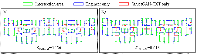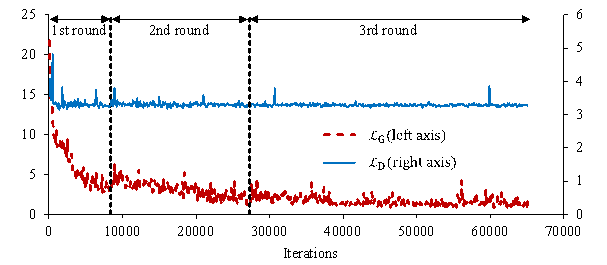 Figure 11 shows a comparison of proxy labels before and after optimization. The original design condition of this proxy label is S3H3, and the new design condition is S3H4. Since Model-SL is biased, it fails to generate sufficient shear walls under S3H4, and the resulting design is similar to that under S3H3, as shown in Figure 11(a). After optimization, the total shear‑wall length is significantly increased, which conforms better with the new design condition, as shown in Figure 11(b). Figure 11. Comparison of proxy labels. (a) Before optimization; (b) After optimization.Module 4: Second round of model training The optimized proxy-labeled data are added into Dataset-SL to form Dataset-SB (Small, Balanced), whose data distribution is shown in Figure 10(b). Model-SB is trained on Dataset-SB from the checkpoint of Model-SL using the hyperparameters given in Table 2. For comparison, Dataset-SB-F (Small, Balanced, Fake) is constructed based on the traditional self-training. Its data distribution is consistent with Dataset-SB (Figure 10(b)), but its proxy labels are directly generated by Model-SL without performing structural optimization. Similarly, Model-SB-F is trained on Dataset-SB-F from the checkpoint of Model-SL using the hyperparameters given in Table 2. Module 5: Second generation of proxy labels The second-generation proxy labels are used to further expand the small, balanced dataset, covering all design-condition combinations. Forty-five sets of inputs are constructed in total (i.e., three inputs for each design‑condition combination), and the corresponding proxy labels are generated using Model-SB. Module 6: Third round of model training The second-generation proxy-labeled data are added into Dataset-SB to form Dataset-LB (Large, Balanced), whose data distribution is shown in Figure 10(c). Model-LB is trained on Dataset-LB from the checkpoint of Model-SB using the hyperparameters given in Table 2. For comparison, Dataset-LB-F (Large, Balanced, Fake) is constructed based on the traditional self-training. Its data distribution is consistent with Dataset-LB (Figure 10(b)), but its proxy labels are generated by Model-SL instead of Model-SB. Model-LB-F is trained on Dataset-LB-F from the checkpoint of Model-SL using the hyperparameters given in Table 2. A typical training curve for the above-mentioned three rounds of model training is shown in Figure 12. Since the training set keeps increasing, the number of iterations in the three training rounds increases sequentially, which takes approximately 1h, 2h, and 4h training time, respectively. Figure 12. Typical training curve4.2 Evaluation metricsStructGAN-TXT models are tested on the balanced test set. The following metrics are used to evaluate the design performance [23].