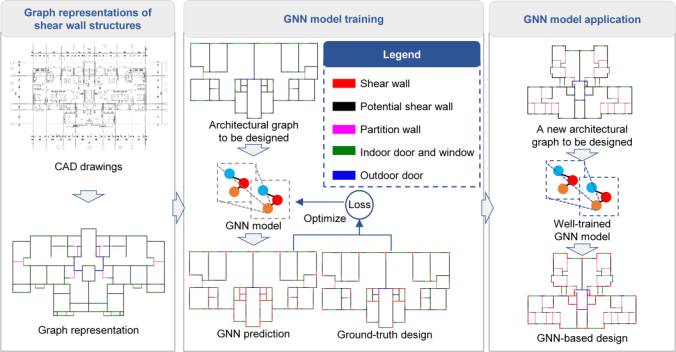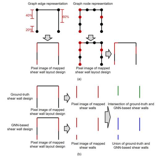 AbstractStructural scheme design of shear wall structures is important because it is the first stage that guides the project along its entire structural design process and significantly impacts the subsequent design stages. Design methods for shear wall layouts based on deep generative algorithms have been proposed and achieved some success. However, current generative algorithms rely on pixel images to design shear wall layouts, which have many model parameters and require intensive calculations. Moreover, it is challenging to use pixel image-based methods to reflect the topological characteristics of structures and connect them with the subsequent design stages. The above defects can be effectively solved by representing a shear wall structure in graph data form and adopting graph neural networks (GNNs), which have a robust topological-characteristic-extraction capability. However, there is no existing research using GNN methods in the design of shear wall structures owing to the lack of graph representation methods and high-quality structural graph data for shear walls. Therefore, this study develops an intelligent design method for shear wall layouts based on GNNs. Two graph representation methods for a shear wall structure—graph edge representation and graph node representation—are examined. A data augmentation method for shear wall structures in graph data form is established to enhance the universality of the GNN performance. An evaluation method for both graph representation methods is developed. Case studies show that the shear wall layout designed using the established GNN method is highly similar to the design by experienced engineers. Keywordsgraph neural network; graph representation method; shear wall structure; intelligent shear wall layout design; deep learning 1. IntroductionHigh-rise buildings are commonly being built with global urbanization [1-2]. Shear walls can effectively resist lateral loads and are usually reinforced concrete walls. The shear wall is the main element that resists horizontal loads in a shear wall structure [3]. Reinforced concrete shear wall structures are becoming the primary high-rise building type [3]. However, most of their structural scheme design processes are manual, necessitating an improvement in efficiency. To this end, automated design methods have been an emerging research topic, with advances based on evolutionary algorithms and neural networks. Automated design methods based on evolutionary algorithms [4-6] rely on explicitly defined constraints and rules. They face the following challenges: (a) Explicit definitions of design rules are rarely sufficient because it is prohibitively difficult to consider all constraints a priori. (b) Potential conflicts and priorities between constraints are obscure. Resolving these conflicts between multiple objectives and constraints is nontrivial. (c) Programing complex constraint rules into computers is not straightforward. Intelligent structural design methods include pixel image-based deep learning methods using convolutional neural networks (CNNs) [7-9] and generative adversarial networks (GANs) [10-12]. Pixel image-based methods use pixel images (such as BMP or PNG images) as the data format, and pixel images can be represented using 3D tensors generally. However, high-resolution pixel images are required to represent a shear wall structure, leading to overwhelming model parameters and computational workloads. Moreover, using pixel images to represent structures cannot trivially reflect the topological characteristics of structures, and connecting them with the subsequent design stages is inconvenient. This paper attempts to find an alternative solution and overcome the limitations associated with evolutionary algorithms and pixel image-based deep learning methods. It was discovered that graph data consisting of graph nodes and edges are potent forms for representing topological relationships between elements [13-14] and connect precisely with structural forms. Graph neural networks (GNNs) operate on graph data, typically non-Euclidean [15-17], and involve significantly fewer parameters and less computational expense. Therefore, GNNs are promising candidates to represent the topological characteristics of complex systems and contribute to the automated design of shear wall structures. Existing GNNs and other graph-related neural networks are mainly used in structural designs with simple structural forms (e.g., frame structures) [18-22]. Although GNNs are sophisticated in representing complex topological features, they are yet to be applied to the design of shear wall structures for the following reasons: (a) Graph representation methods for shear wall structures are lacking. An appropriate graph representation method is the foundation for applying GNNs to structural design; however, there is no graph representation research for shear wall structures. (b) There is a lack of high-quality structural data represented in graph form. Data are frequently key constraints in data-driven intelligent methods. This study aims to push the envelope and bridge the gaps in developing a GNN-based design method. Section 3 outlines the proposed GNN-based design method. Section 4 introduces the graph edge and node representation methods of a shear wall structure, data augmentation method, and GNN models developed in the study. Section 5 discusses the performance of the different graph representation methods and GNN models. Section 6 presents case studies under various design conditions. 2. Literature Review2.1. Intelligent Design MethodsAutomatic and intelligent design methods are widely used in architectural and structural designs [23-26]. Manfred et al. [23] realized instant structural feedback and performance prediction for architectural conceptual designs based on SketchUp. Boonstra et al. [24] proposed a hybrid method of an evolutionary algorithm and simulations of co-evolutionary design processes to opti