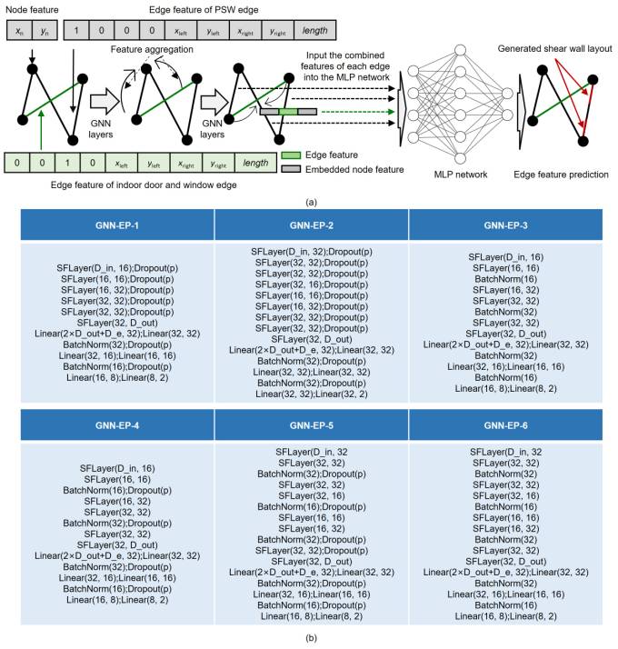 Note: xn and yn are node coordinates; xleft and yleft are node coordinates at one end of the edge, and xright and yright are node coordinates at other end of edge. 4.3. Augmentation and Grouping of Shear Wall Structure GraphsData augmentation is a common and useful method for improving the generalizability of model performance [61]. The rigid-body displacement of an entire shear wall structure in a drawing does not affect the layout of the shear walls. Therefore, this study establishes a random combination of data augmentation methods. These include upside-down flipping (two cases), counterclockwise rotation with a modulus of 90° (four cases), up or down translation with a modulus of 2 m and a range of 0–20 m (21 cases), and left or right translation with a modulus of 2 m and a range of 0–20 m (21 cases). The data volume is equivalent to being enlarged by 2 × 4 × 21 × 21 = 3528 times. This data augmentation process is embedded in the training process of the GNN models. Liao et al. [10] found that individual training for different design condition groups can categorically consider the effects of different seismic design intensities and structural heights on the shear wall layout and wall ratio of shear wall structures. Therefore, based on their research, in this study, the dataset of shear wall structures is divided into three design condition groups: Group7-H1, Group7-H2, and Group8. The shear wall structures in Group7-H1 possess seismic design intensities of 7°, i.e., the peak ground acceleration (PGA) with 10% probability of exceedance in 50 years is 100 cm/s2, and structural heights ≤50 m. The shear wall structures in Group7-H2 have seismic design intensities of 7° and structural heights >50 m. The shear wall structures in Group8 possess seismic design intensities of 8°, i.e., the PGA with 10% probability of exceedance in 50 years is 200 cm/s2. Specifically, there are 96, 70, and 128 training sets and 10, 10, and 10 testing sets in Group7-H1, Group7-H2, and Group8, respectively. 4.4. GNN Models for Shear Wall Layout DesignGNNs can well capture the topological features of structures through the feature enhancement of graph edges [19]. In particular, for a graph edge representation method for shear wall structures, edge features are crucial for the shear wall layout design based on edge feature prediction. Moreover, Zhao et al. [19] demonstrated the advantages of edge feature-enhanced GNN models over other GNN models. Therefore, this study adopts the Graph-SF model proposed by Zhao et al. [19] as the core algorithm of the developed GNN models. For the graph edge representation methods for shear wall structures, The shear wall layout design is abstracted as an edge feature prediction problem in the GNN for the graph edge representation methods for shear wall structures, as shown in Figure 5(a). The neural network form is coupled with a multilayer perceptron (MLP) after the GNN part to predict the edge features. The input features of the MLP network are the combined feature of an edge and the nodes at both ends, and their dimensions are 2×D_out+D_e (refer to Table 3 for the definitions of the parameters). When designing a shear wall layout based on edge feature prediction, the arrangement of the shear walls is represented by their length ratios at both ends of a PSW graph edge. Therefore, the length ratios of the shear walls at both ends of a PSW graph edge are the output features of the GNN models, which have two dimensions. The L1 loss function, i.e., mean absolute error [62], as expressed in Equation (3) is adopted.
