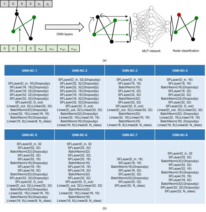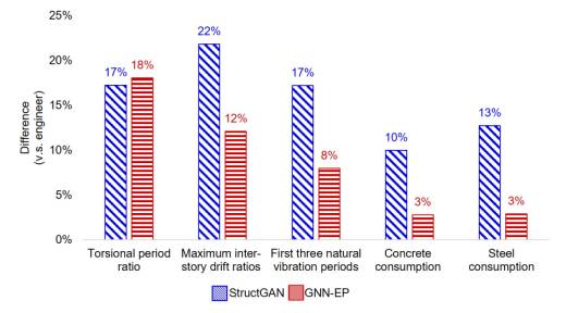 Overall, the evaluation results of Edge-PSW, Edge-PSW-DW, Edge-PSW-PW, and Edge-PSW-PW-DW are similar, showing that considering PWs, doors, and windows has little effect on the results. From the average performances of the different design condition groups, Edge-PSW-DW exhibits the best performance. In addition, based on the average results of the different design condition groups, Edge-PSW-DW is better than Edge-PSW, and Edge-PSW-PW-DW is better than Edge-PSW-PW; these trends are consistent with the conclusions presented in Section 5.2. 6.2. Comparison with StructGAN Designs6.2.1 Computational ResourceWhen the training batch size is 4, a GPU with at least 20 GB of memory is required to train the pixel-image-based StructGAN model [10]. In contrast, only 0.7 GB of GPU memory is required for all GNN models in this study. Therefore, in contrast to the pixel convolution-based deep neural network method, the proposed GNN method significantly reduces computational resources. 6.2.2. Shear Wall Layout DesignFigure 9 shows the differences in the shear wall layouts on pixel images obtained from the typical results designed by the developed GNN-EP-4 model and those designed by the StructGAN model proposed by Liao et al. [10]. One building is designed under a seismic design intensity of 7° (Group7), and another is designed under that of 8° (Group8). The results show that the shear wall layout designed using the developed GNN-EP-4 model is comparable to the design of engineers. Moreover, it provides good shear wall layouts in the elevator shaft (zone ④ of Group7 and zone ③ of Group8 in Figure 9) and balcony (zone ① of Group7 and zones ① and ② of Group8 in Figure 9) areas. Figure 9 Design results of cases of Group7 and Group8 6.2.3. Mechanical Performance and Material ConsumptionThree cases are selected from each of Group7-H1, Group7-H2, and Group8 for a detailed analysis of the mechanical performance and the material consumption. Except for the shear walls, the layout and dimensions of the beams and slabs are designed based on the study by Zhao et al. [33]. The design results of engineers, StructGAN, and the developed GNN-EP-4 model are presented in detail in Appendix B. Figure 10 compares the mechanical performance and material consumption of the StructGAN and GNN-EP model design results with the design of engineers. The GNN-EP model and StructGAN designs have similar torsional period ratio differences. However, in terms of the remaining indicators (i.e., the maximum inter-story drift ratio, first three natural vibration periods, concrete consumption, and steel consumption), the design results of the GNN-EP model are much closer to the design of engineers than those of StructGAN. Thus, the GNN-EP model can better learn the characteristics of the design of engineers from the design drawing dataset than StructGAN, leading to design results that are more similar to those of engineers. Figure 10 Difference in mechanical prosperities and material consumption of typical cases of Group7-H1, Group7-H2 and Group8 between design results of neural network models and those of engineers. It should be noted that this research aims to ensure that the artificial intelligence design results are maximally similar to the designs of engineers. This is because the engineering design drawings used in this study are real-world practical engineering design solutions, which are fine in themselves. The future research can include a priori optimized variants of these design results, for instance, using optimization algorithms that can fully consider factors such as structural performance and construction cost. 7. ConclusionThis study develops a GNN-based intelligent design method for shear wall layouts. GNN models are trained using a data-augmented dataset of predefined shear wall structures. Graph representation methods and GNN models for shear wall structures are examined and validated. By inputting the architectural design graph of the shear wall structure to be designed, the well-trained GNN models can generate a shear wall layout design comparable to the design of engineers. The detailed conclusions are as follows. (1) The established graph edge representation method is better than the graph node representation method for shear wall structures. The edge feature prediction GNN model, GNN-EP-4, is the optimal GNN model, which has the highest score in all graph edge representation scenarios. (2) The case studies show that the four graph edge representation methods for shear wall structures have similar performances, and the optimal method is Edge-PSW-DW. Therefore, PSWs are necessary for graph representation in a GNN-based shear wall structural design. In practical applications, using Edge-PSW-DW with the edge feature prediction GNN model, GNN-EP-4, is recommended. (3) The case studies show that the developed GNN-EP model has a mechanical performance and material consumption that are closer to the design results of engineers than those of the StructGAN method based on pixel images. Declaration of Competing InterestThe authors declare that they have no known competing financial interests or personal relationships that could have appeared to influence the work reported in this paper. AcknowledgmentsAppendicesAppendix AAs a supplementary exploration of the graph edge representation methods, graph node representation methods for shear wall structures are examined. In the latter, a shear wall layout design is abstracted as a node classification problem in the GNN model, as shown in Figure A.1(a). Eight GNN models with different hyperparameters, namely GNN-node classification (GNN-NC), as shown in Figure A.1(b) are studied. Similar to the GNN-EP models, the GNN-NC-1–GNN-NC-6 models are combinations of a GNN and an MLP network. Models GNN-NC-7 and GNN-NC-8 contain only the GNN. The definitions of SFLayer(), Linear(), BatchNorm(), Dropout(), p, D_in, and D_out in Figure A.1(b) are the same as those provided in Table 3